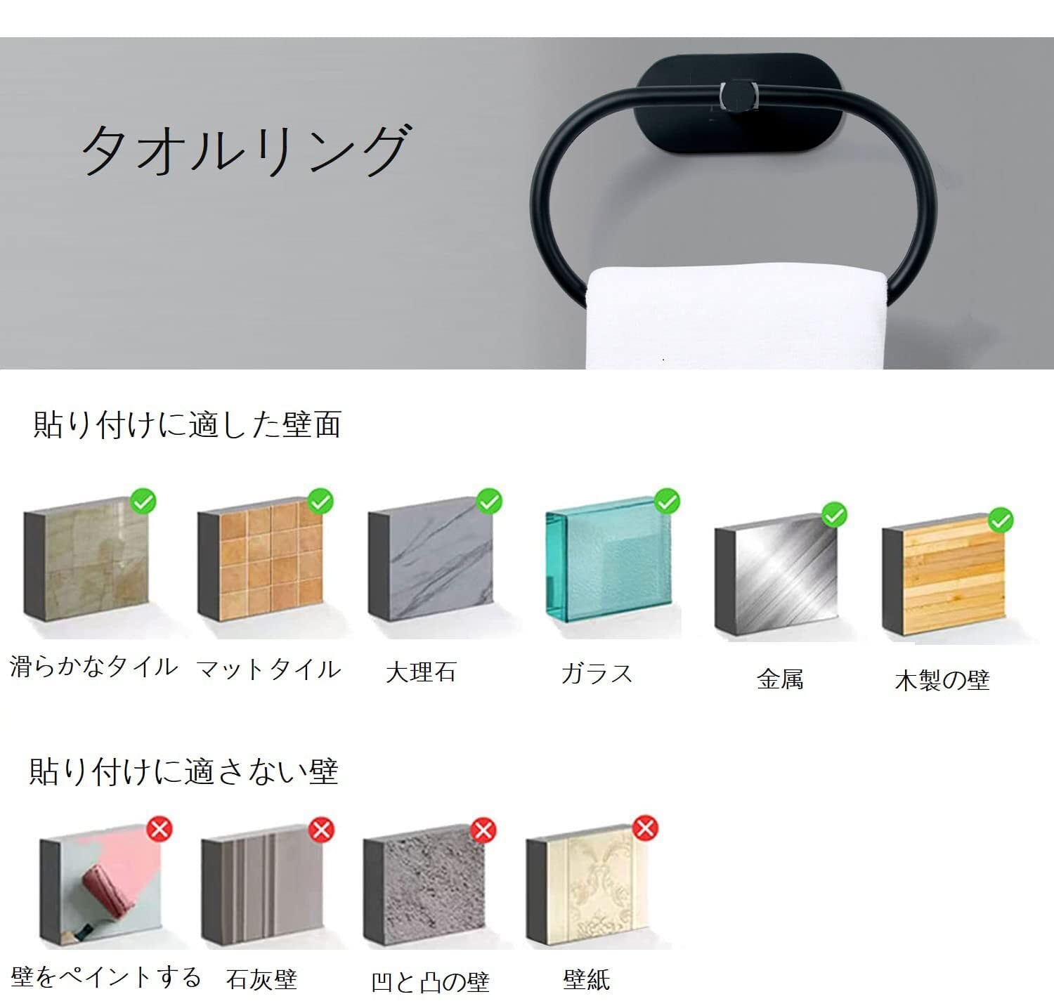 【注意事項】平らなところに貼ってください。塗装壁、石膏壁、壁紙、粗面は適用されません。貼り付け後24時間待った方が効果的です。