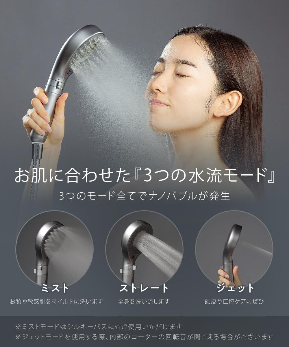 【お肌に合わせた、3つの水流モード】気持ち良いとご好評のミスト。全身を洗い流すためのストレート。口腔ケアや頭皮洗浄のためのジェット。3つのモード全てでナノバブルが発生します。※ミストモードはシルキーバスにもご使用いただけます