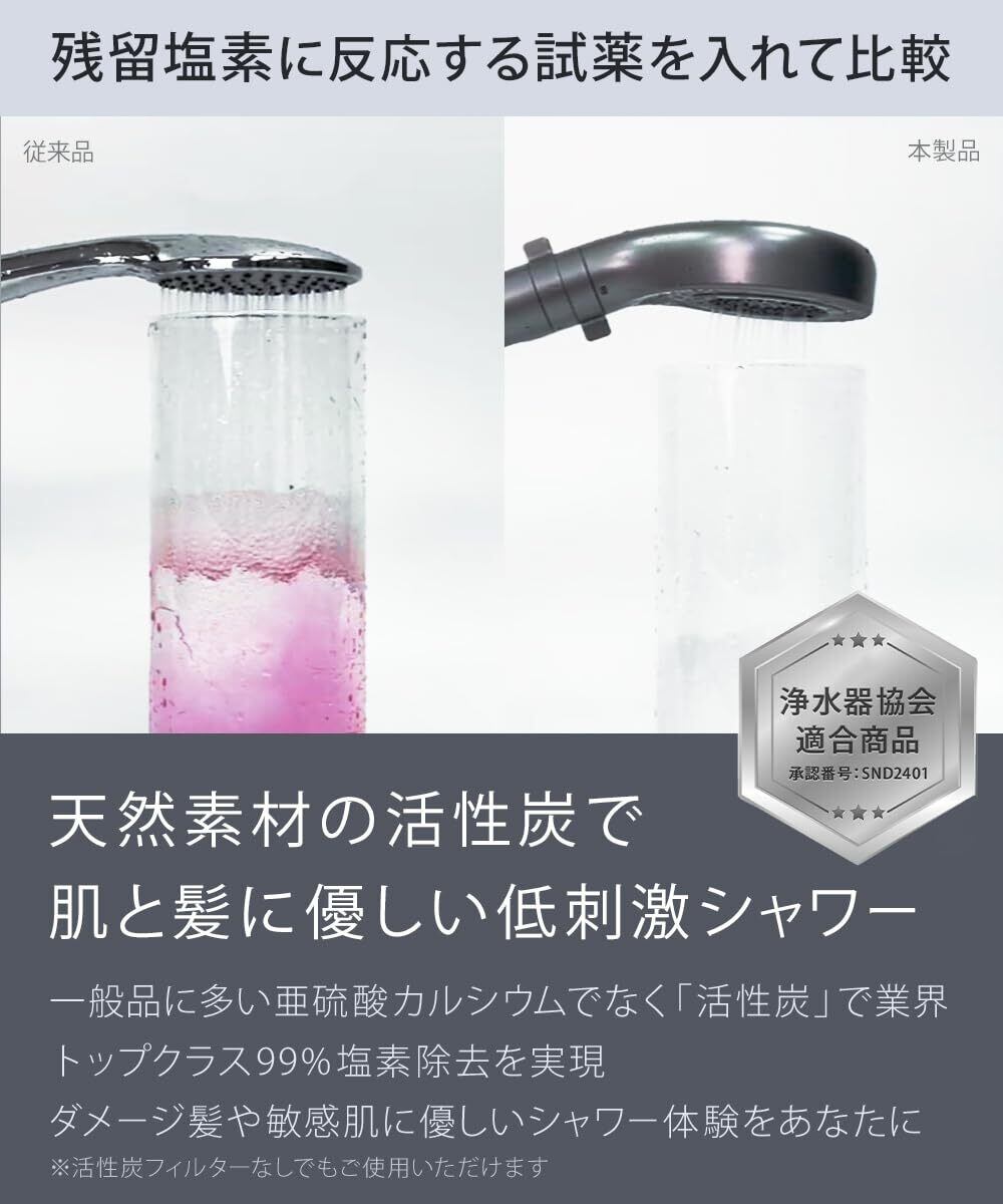 【業界トップクラス 99% 塩素除去】世界と比べて、日本の水道水に多く存在する、残留塩素は髪や肌を構成しているタンパク質を痛めるという作用があり、ダメージ髪や肌トラブルの原因に。毛穴より小さく肌の奥まで届くナノバブルシャワーだからこそ、99%塩素除去したお肌に優しいシャワー体験をあなたに。【浄水器協会認証】浄水器協会の基準 JWPA J:2021に基づき製造、試験され、浄水器協会がその内容を確認し承認した製品です※承認番号:SND2401 塩素チェッカー同梱:塩素除去を実感いただく為に、塩素チェッカー(残留塩素試薬)を2包同梱しております。ぜひ、お客様ご自身の目でご確認ください!