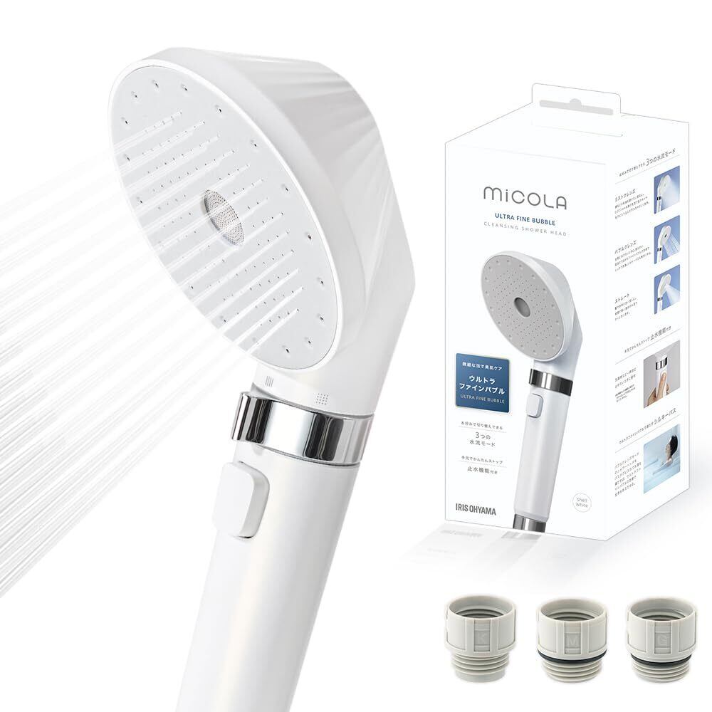 アイリスオーヤマ シャワーヘッド マイクロナノバブルよりも上位モデル ウルトラファインバブル 節水約50% 毛穴洗浄力約61%UP 選べる3つの流水モード 3種のアダプター付き FBIA会員認定 保温保湿 毛穴汚れ対策 美肌 クレンジングシャワー シェルホワイト MiCOLA | KSショップ