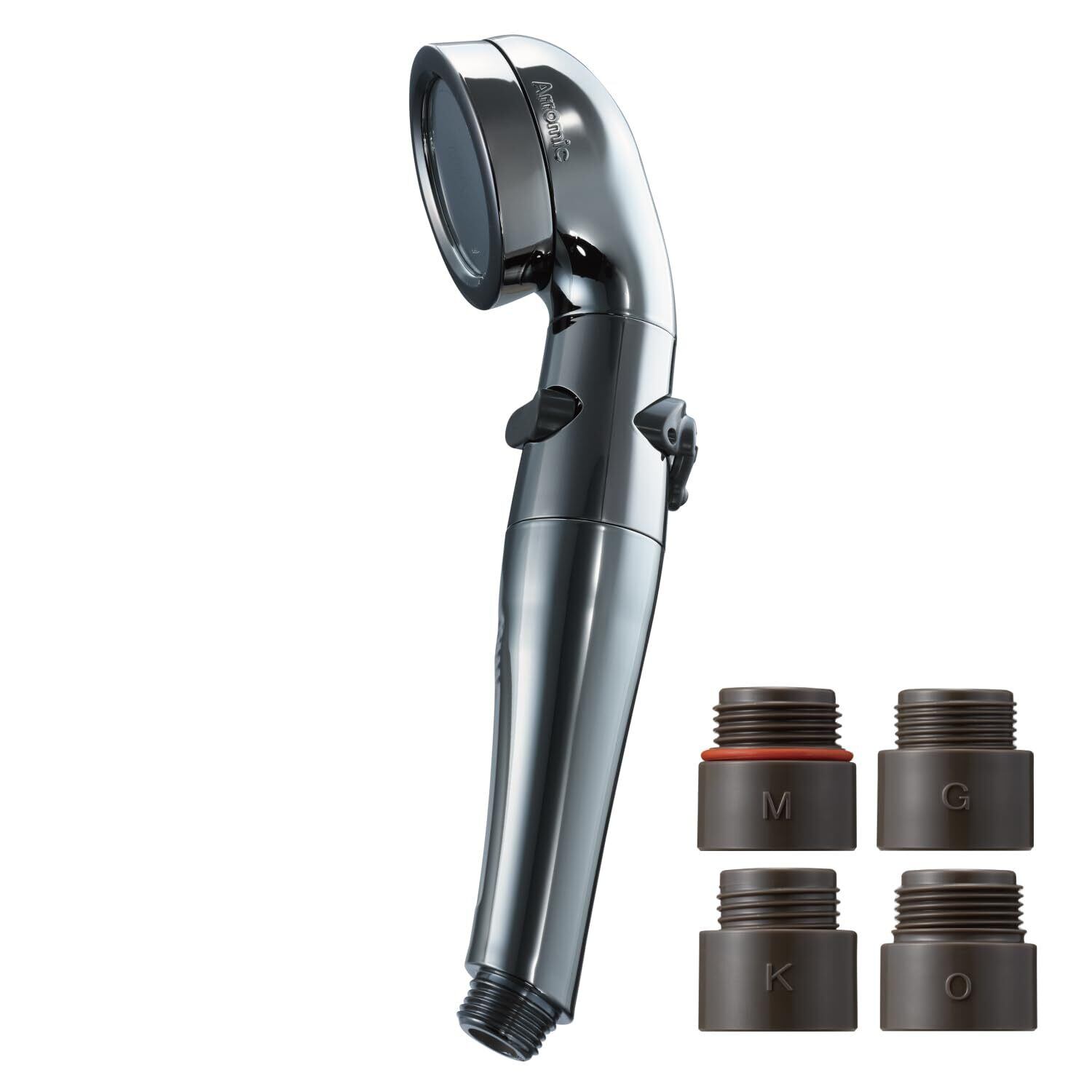 節水効果最大70%、安心ストップ機能、水量調節機能を備えたアラミックオリジナルプレミアムシャワーヘッド。アダプター4種類×各1個付き。