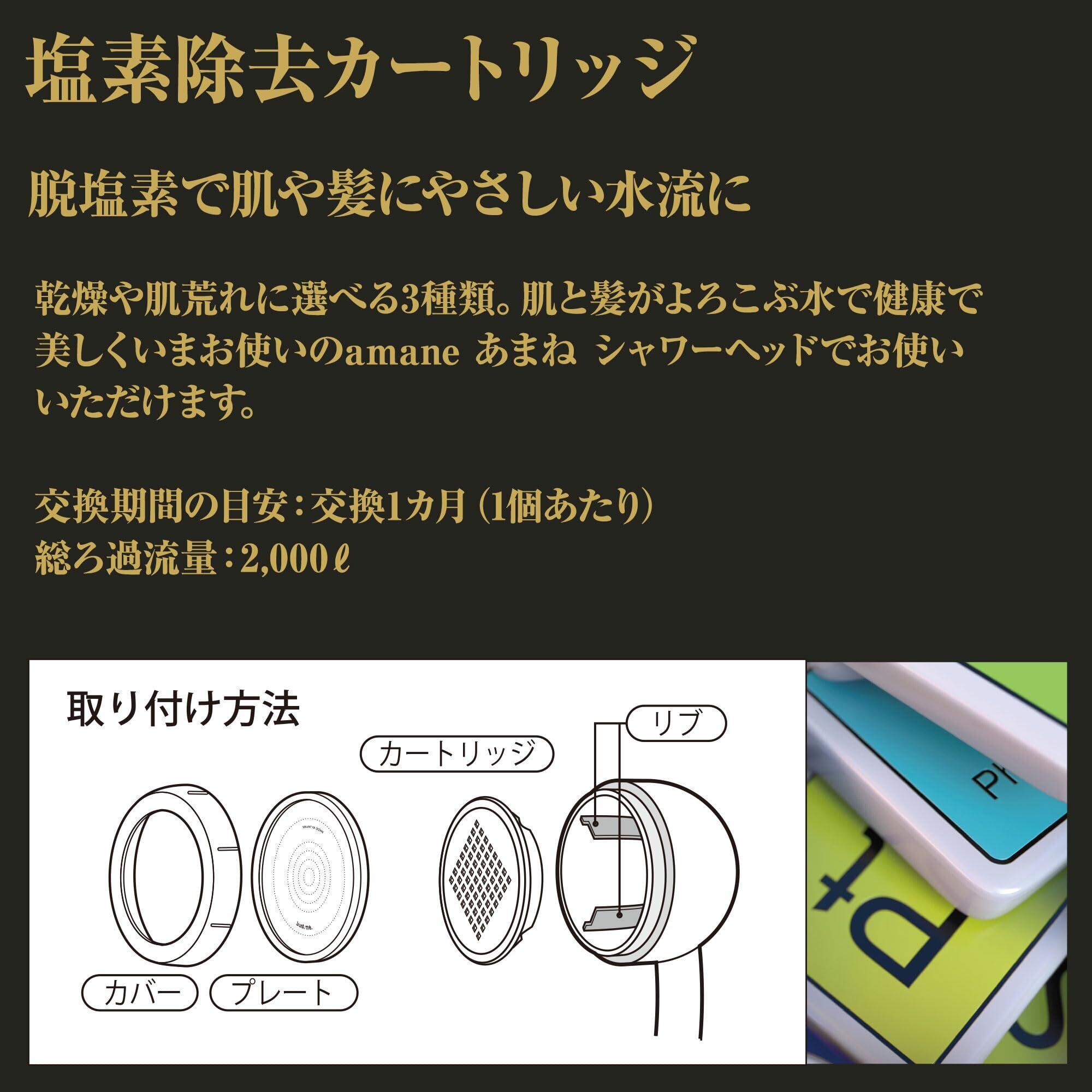 【選べるカートリッジ】①髪と肌にダメージを与える残留塩素を除去。髪と肌だけでなく、水垢の発生防止にも繋がります(目安:約1ヶ月/個、総ろ過流量:2,000L)。 ②洗浄力と保湿力に優れたシャワー専用の重炭酸泉カートリッジにより、重炭酸泉が温浴効果を促進。美肌効果を期待できます(目安:20分~30分/錠)。*塩素除去と重炭酸泉の併用不可。