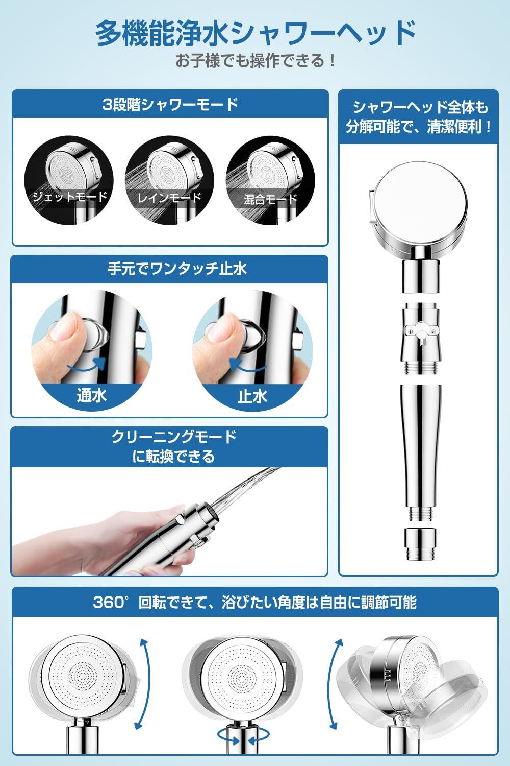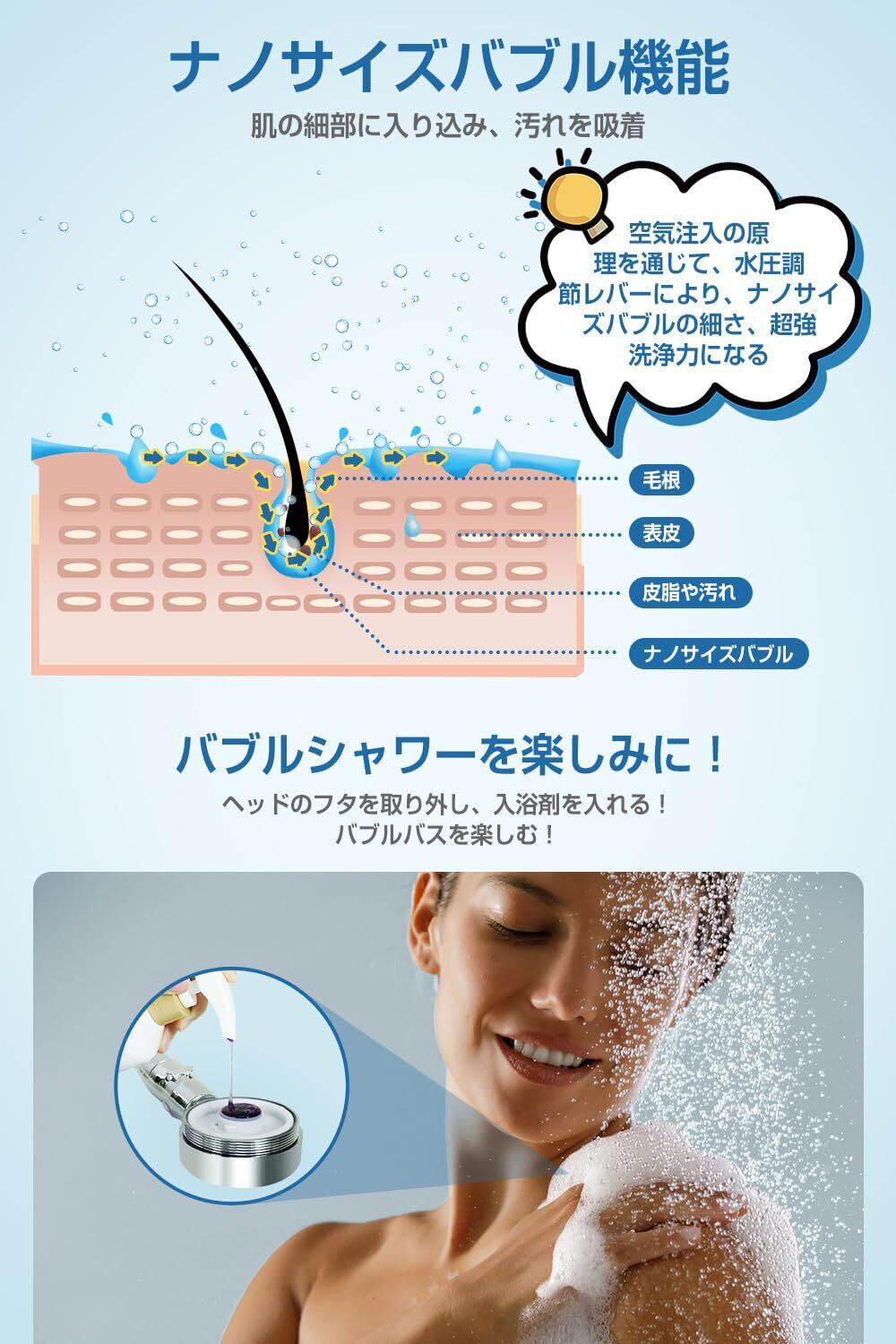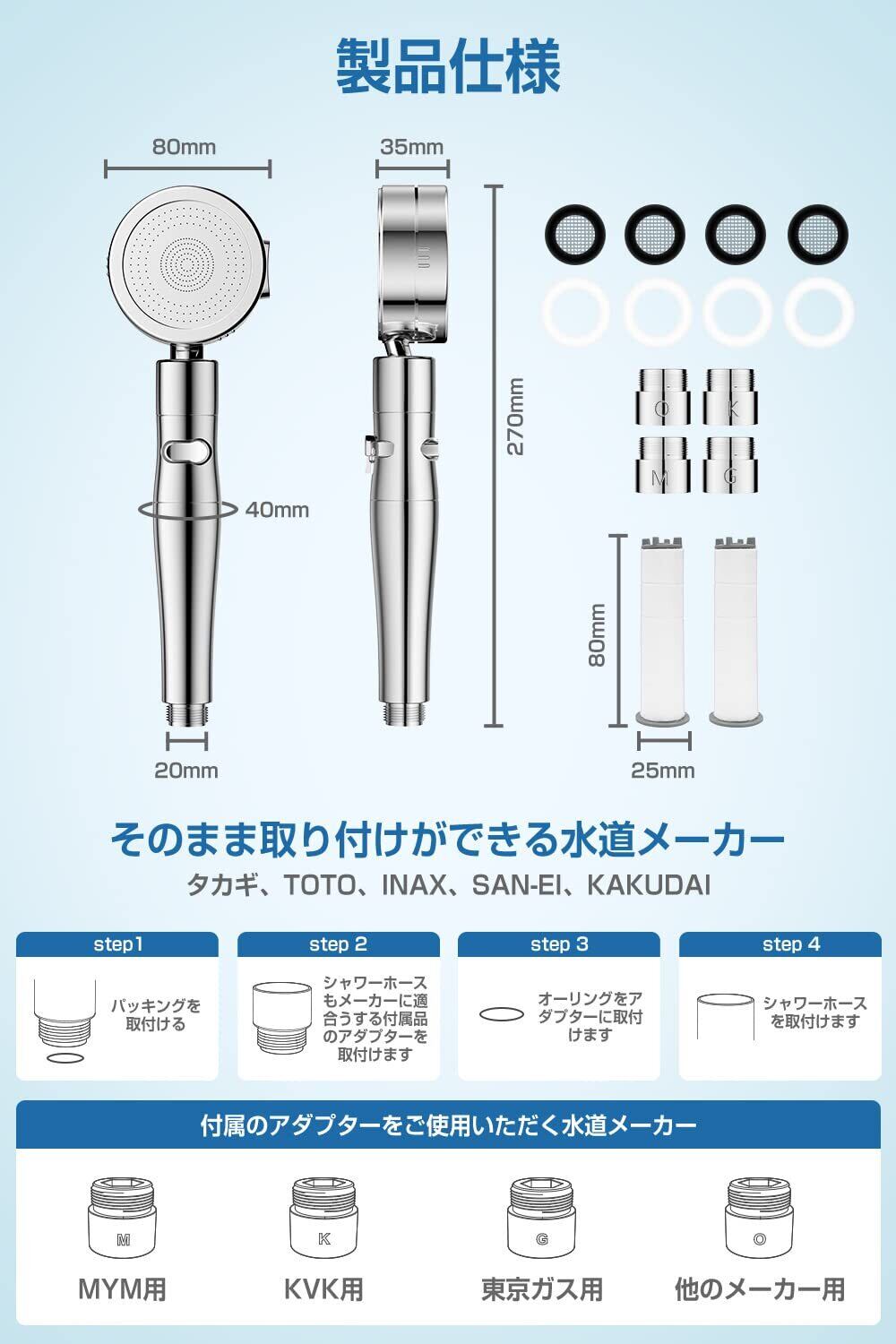 【極細水流×2重浄水×美肌可能】シャワー ヘッドは約304個0.3mm極細穴を構造された散水板、マイクロナノバブルとの超微細の気泡を作れるもので、少量の水でも勢いのある水流になって、洗浄力がよく、水流は細密だが幅広くて、まるでシルクのような感じが得られて、使用後肌の水分量が20%以上アップ!シャワーヘッドの塩素除去カートリッジは国際的に認められた亜硫酸カルシウム球を用いて水を濾過し、塩素を徹底的に除去可能!肌や髪に優しいしゃわーへっどで、お肌も敏感な方がご安心ください。