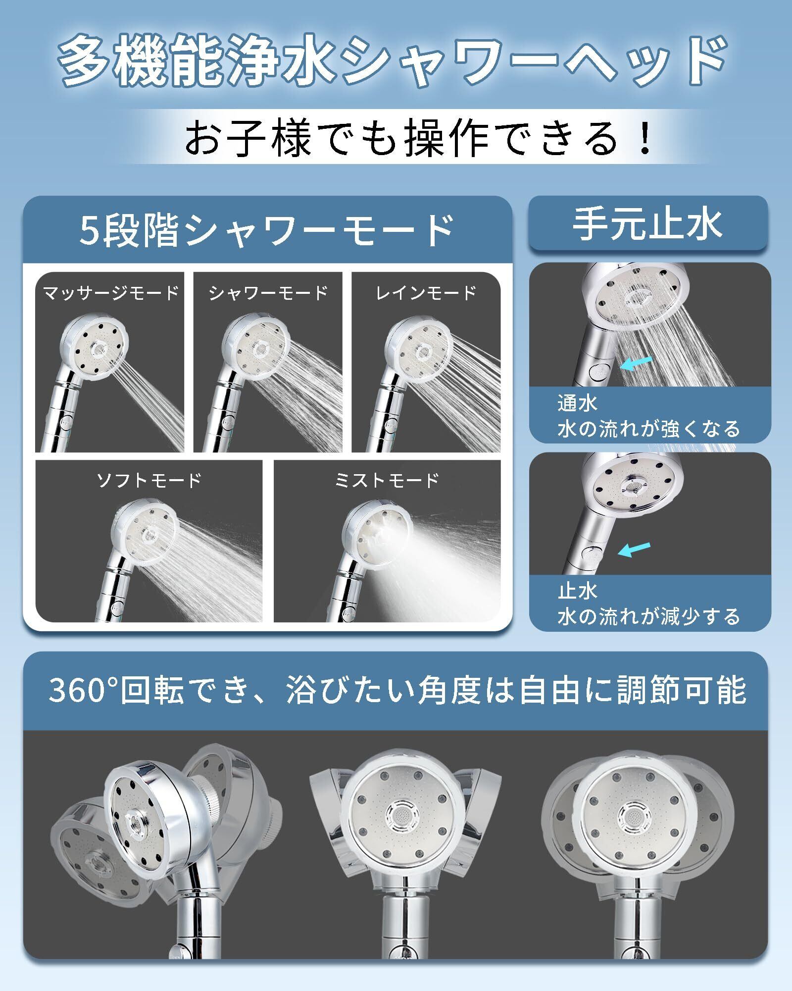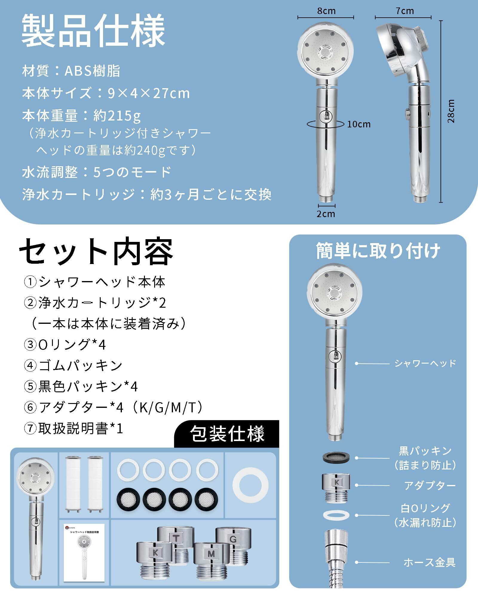 【面倒な工具や業者不要!驚くほど軽いボディ設計と、『日本の蛇口にそのまま対応』】M/K/G/Tの4種類のアダプター付き(内ネジ式・外ネジ式・差し込み式・固定金具式)、ご家庭の蛇口タイプを選ばず、『10秒で』確実に取り付け完了!女性やお子様の力でもラクラク設置可能です。従来のシャワーヘッドで悩まされていた『水アカの詰まりによる水流低下』を完全に防止! 外したノズルは、ほんの少しの水洗い、またはお酢に浸すだけで、新品同様の清潔さを取り戻せます。 ※モード切り替え時は水温が変わりますのでご注意ください。(例:ミスト使用時は「+2℃」がおすすめ!)モード変更時の温度調整をお忘れなく、熱さ・冷たさに気をつけてください。