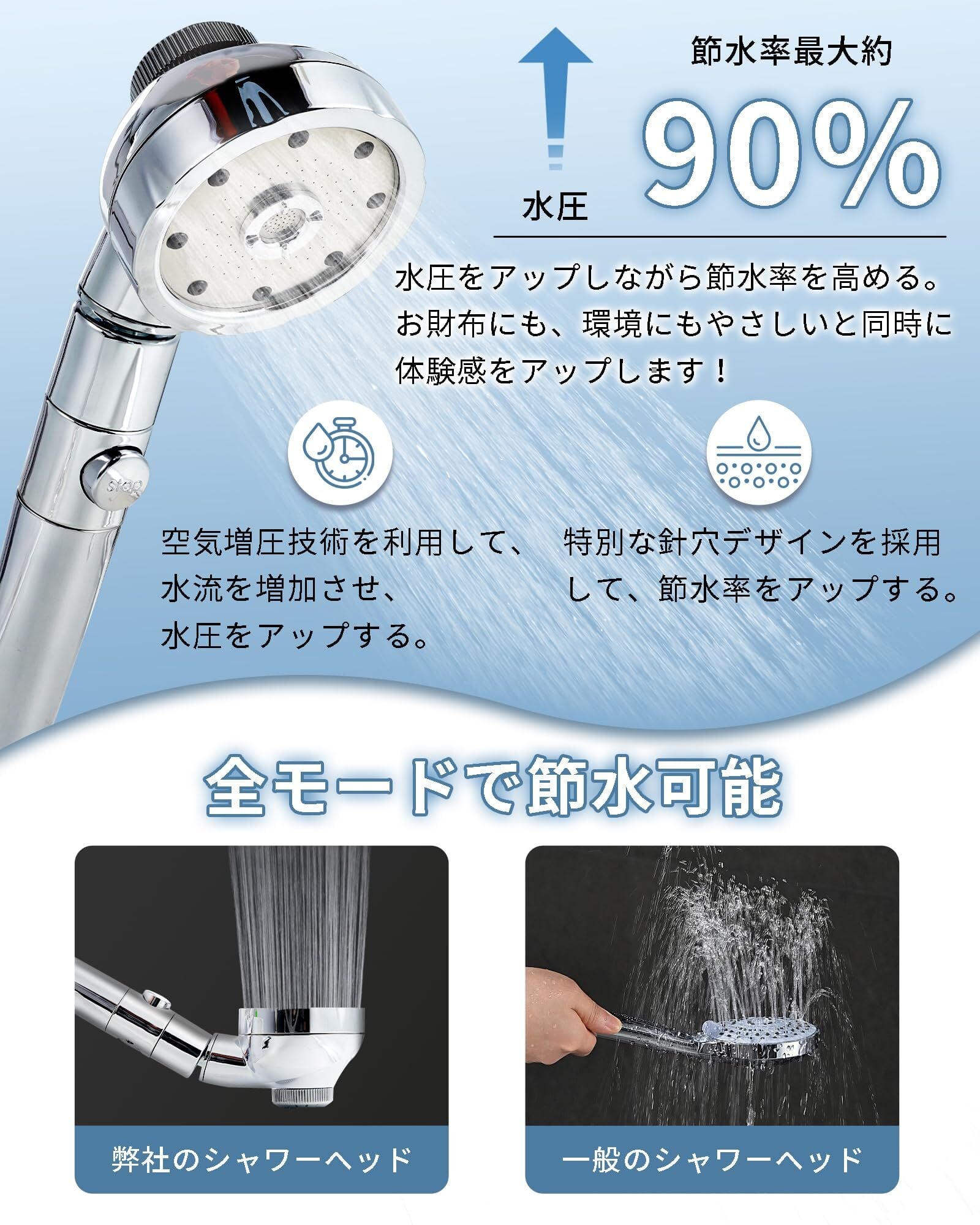 【シャワーヘッドの手元止水 智能進化】シャンプーやボディソープをつけるたびに、いちいち蛇口を操作する煩わしさから解放されます。本体に搭載されたワンタッチボタンをポンッと押すだけで、瞬時に水流をストップ。再開も同じボタンを押すだけなので、手が泡だらけでも、濡れていても、とにかくラクチン! 小さなお子様やご高齢の方でも、簡単・安全に操作できる設計です。使いやすさと節水を両立した、賢いバスタイムの必須アイテムです。