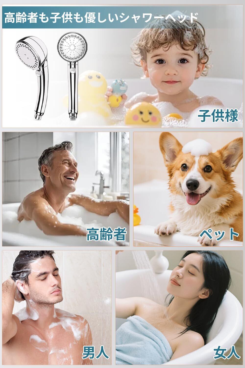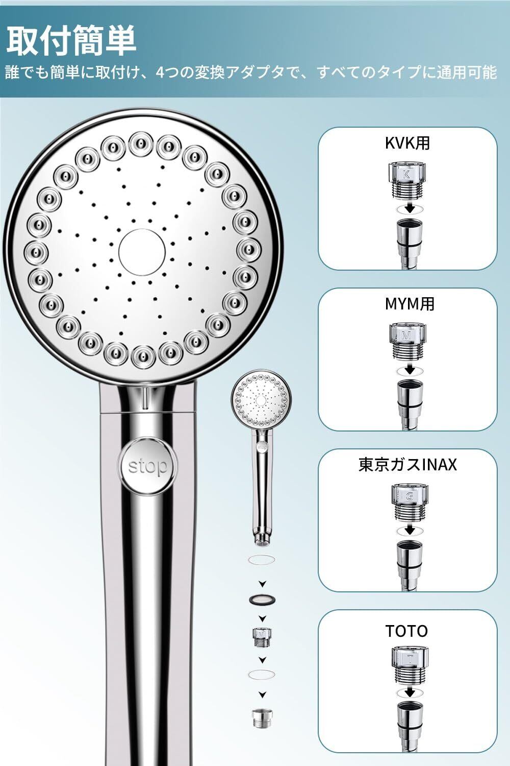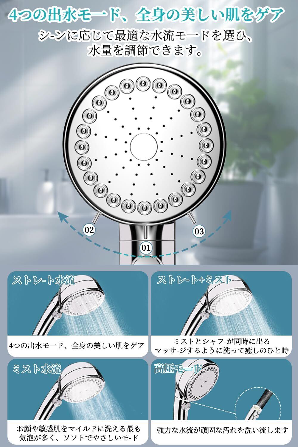 【4つの水流モード・水流を自在に調整】このナノバブル シャワーヘッド1本で、肌・髪・心までケア。3つの水流モードを手元で簡単に切り替え可能。①【ミストモード】:顔などデリケートな部位に最適。ウルトラファインバブルが毛穴汚れをやさしく洗浄。②【ミスト+ストレート】:マッサージ感覚で、癒しとリラックスを両立。③【ストレートモード】:髪や体をしっかり洗い流したいときに最適。気分や用途に応じて、理想的な水流体験を。④高圧モードで浴室の掃除がもっと簡単になります。ご自身の心地によりモードを自由に調整できます。各モードはお肌にやさしく、子供様、老人でもご家庭で気持ちよく快適使用できるナノバブル シャワーヘッドです。