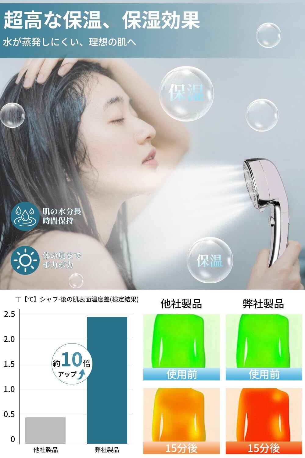 【洗浄力抜群・マイクロナノバブルで美容・保湿・保温 】約15億6000万個のウルトラファインバブルが水中に生成されている シャワーヘッド コウスイアツ 、肌に深く浸透し、通常の水では落としきれない毛穴の奥の汚れや油脂を効果的に取り除けます。特にミストモードでは霧のように細かく、お肌に刺激なく、深くに浸透し、肌の水分を高く、肌の調子を整え美肌効果も促進し、敏感肌の方でもこのミストシャワー ヘッド おすすめです。また、高い保湿力で しっとり潤い肌でお風呂上りも湯冷めしにくい効果が期待できます。温ミストモードで毛穴の奥で弾ける美泡で身体の芯までぽかぽかになります。