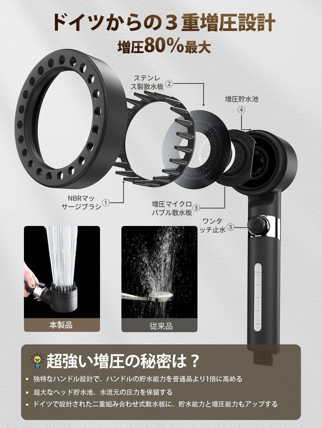 【究極な增压能力で80%アップ】ご心配なさらずにどうぞ!極めて細かいナノバブルを実現している一方で、増圧機能にも妥協はありません!シャワーヘッドの先端には2重組み合わせ型散水板があり、ハンドル部分には超大容量の貯水スペースがあります。さらに三重の増圧技術を使用し、水圧を80%以上向上させることができます!低水圧地域や高層階でも効果的に水圧を高めることができます。また、冬の厳しい寒さの中でも、当社のシャワーヘッドなら水圧の不足による冷たさから解放され、暖かく快適なシャワーを体験できるでしょう。