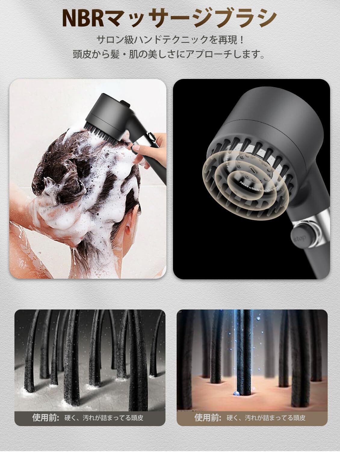 【NBRリラックス・マッサージブラシ】Eaimiuの研究開発は止まることなく進化を続けています!お客様の感覚を最優先に考え、ご自宅で至福のマッサージ体験をお楽しみいただける、比類なきシャワーヘッドを開発しました。この革新的シャワーヘッドは、初めてNBR材質のブラシを採用しています。NBR素材は耐高温性、抗静電性、無臭性、非刺激性を兼ね備え、最も敏感な肌質の方にも安心してお使いいただける優れた素材です。NBR製のシャワーヘッド.は柔らかく、髪を引っ張らずに頭皮をリラックスさせ、清潔にすることができます。疲れた身体に究極の癒しを与え、次の日への活力を充電する理想的なソリューションです。