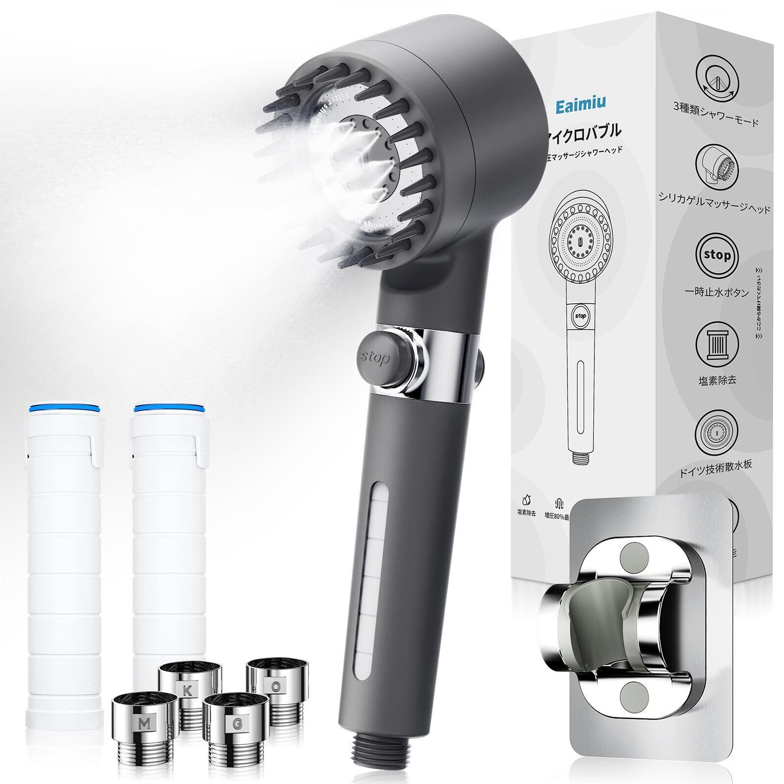 Eaimiu シャワーヘッド マイクロナノバブル [美しさの新次元!0.001mmのナノバブル]高水圧 節水シャワーヘッド 手元止水 水量調節 3段階モード ウルトラファインバブル シャワーヘッド 塩素除去 毛穴ケア 汚れ除去 肌&髪ケア向上 保湿 shower head マッサージブラシ機能 シャワーフックとカートリッジ2本付き 水漏れ防止 M/K/G/Oアダプター付き 取付簡単(グレー) | KSショップ