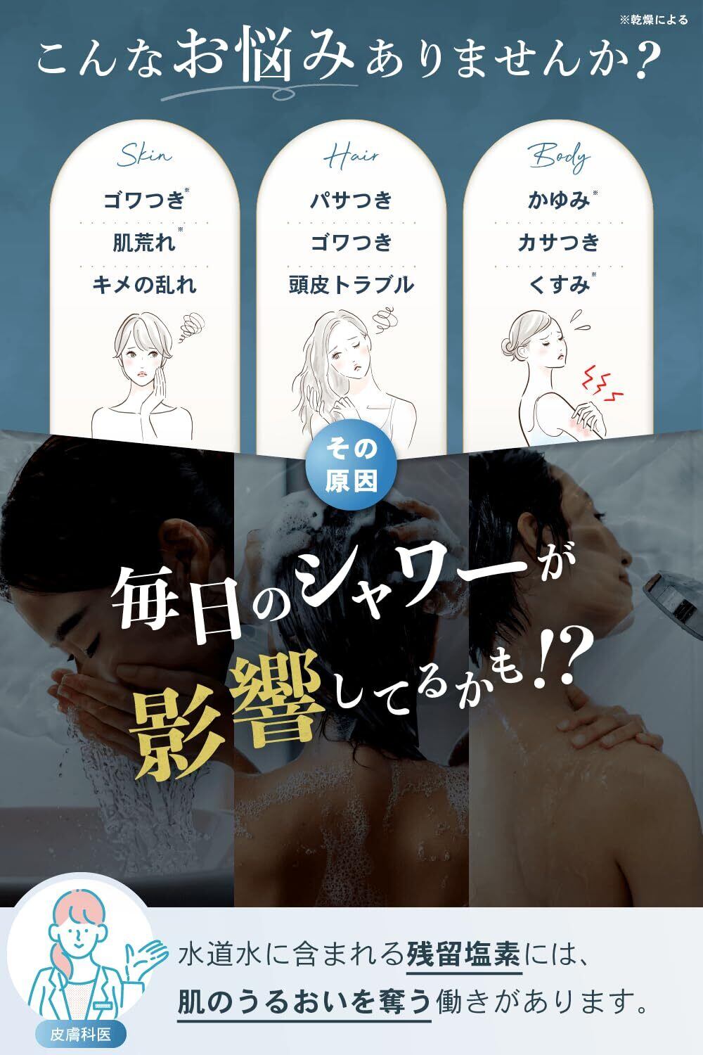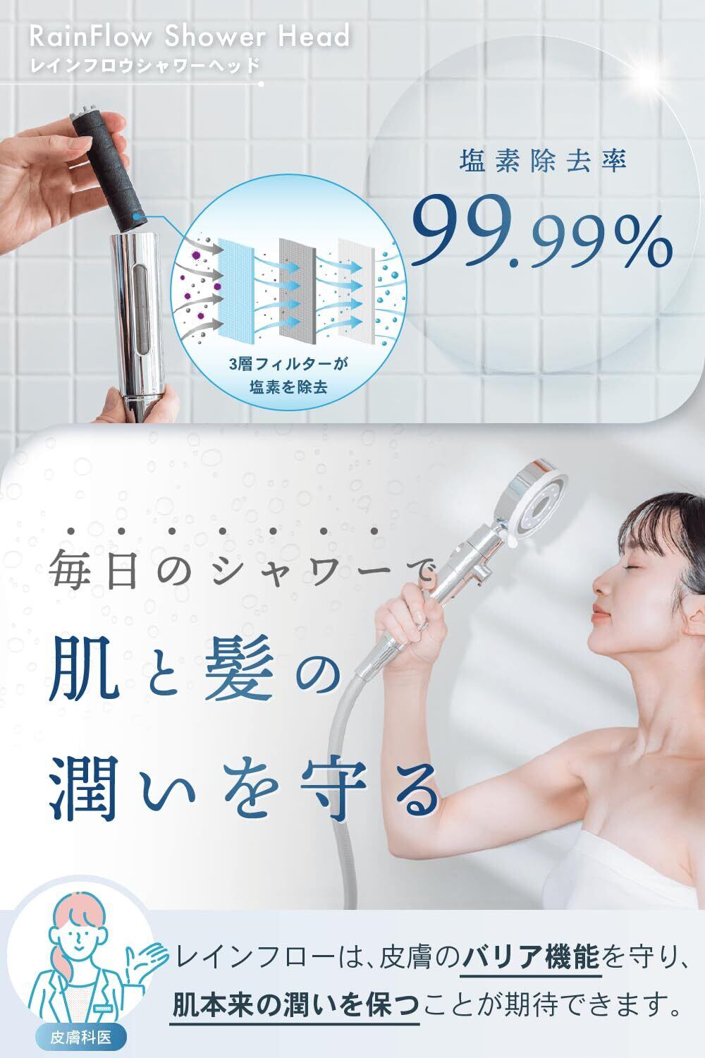 【肌トラブルが気になる方に。専門医監修のRainFlowシャワーヘッドを】 塩素除去機能とマイクロナノバブルのやさしい水流で、肌への刺激を最小限に抑えます。毛穴の奥まで届く微細な泡が汚れを包み込み、敏感肌でも安心。塩素除去にこだわった設計だから、肌トラブルを感じやすい方にもおすすめです。