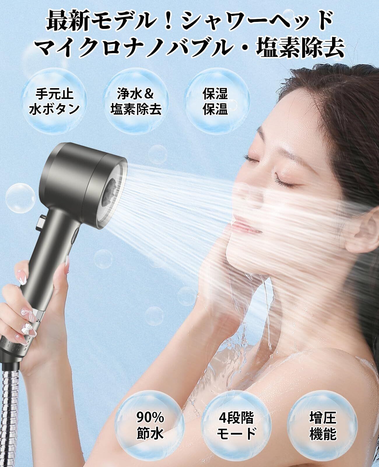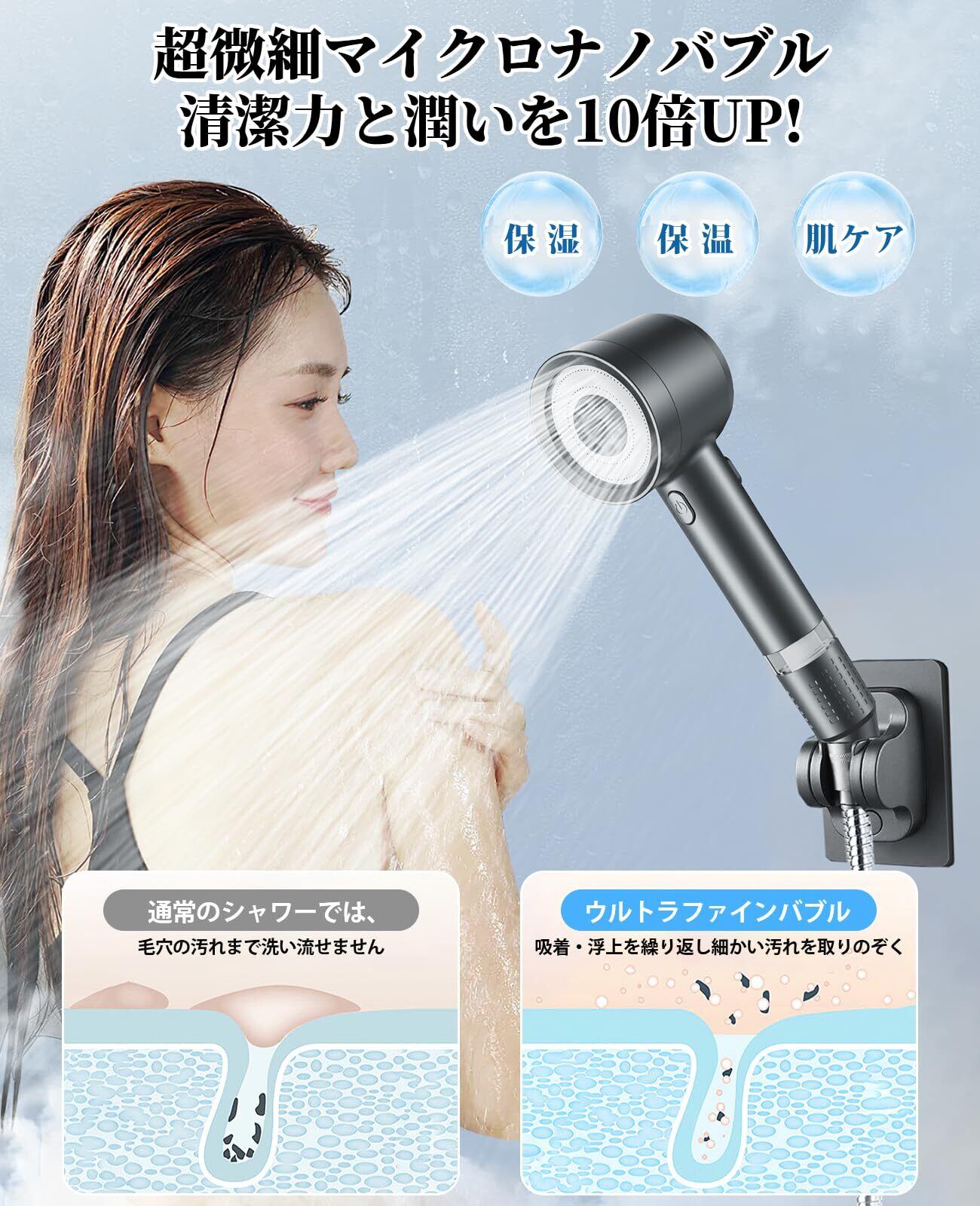 【革新的マイクロナノバブル】斬新なマイクロナノバブルテクニカルを採用し、超微細泡を生成し、水の粒子を極限まで小さくして泡に変えることで、肌や髪に泡が入り込み、しっかりと優しく馴染み、汚れを洗い流せます。汚れをしっかり落としながら、肌の潤いと体温を保つ効果も期待できますので、入浴後も体が潤って暖かいです。日々のシャワーがより快適で贅沢な時間に変わります。