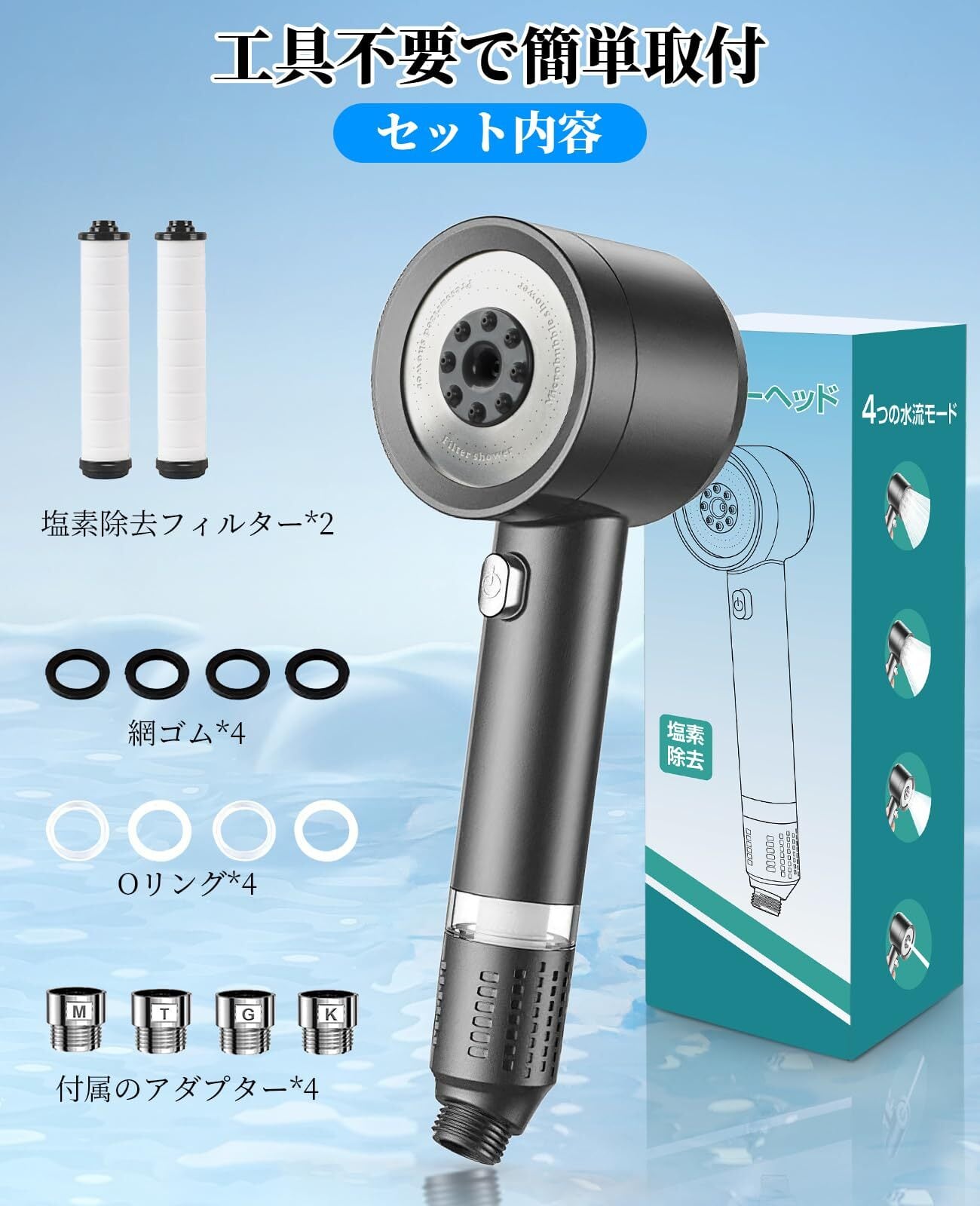 【パッキング内容】パッキング内容には、シャワーヘッド本体、アダプター*4、網ゴム*4、Oリング*4、塩素除去フィルター*2、日本語取扱説明書*1