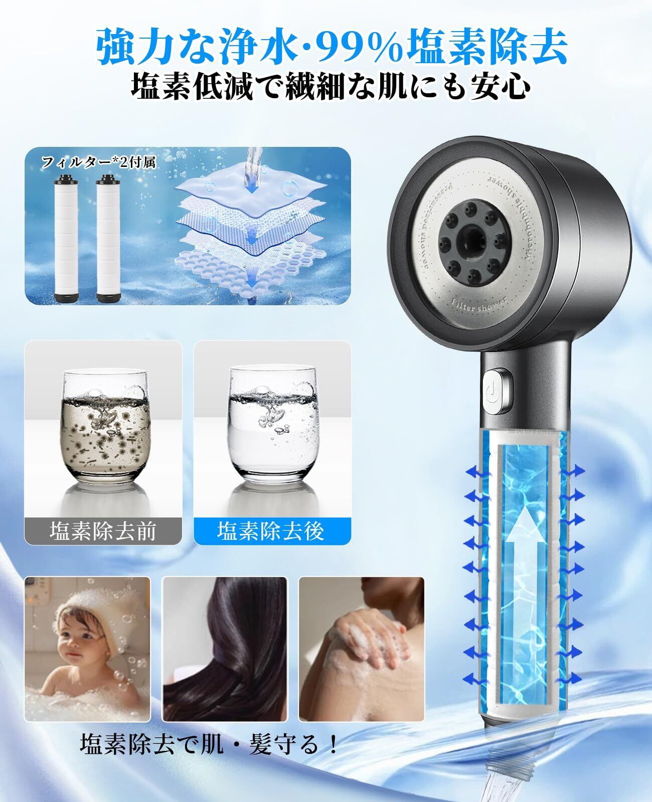 【塩素除去フィルター搭載肌に優しいシャワーヘッド】健康な肌と髪を保つためには、シャワー水のクオリティも重要です。内蔵フィルターが水道水の残留塩素や不純物を効果的にカット。塩素による肌や髪へのダメージを軽減し、乾燥やかゆみの悩みから解放します。肌なじみの良い均一な水流で、心地よいシャワータイムを実現。家族みんなで使える、健やかで美しい肌を育むシャワーヘッドです。