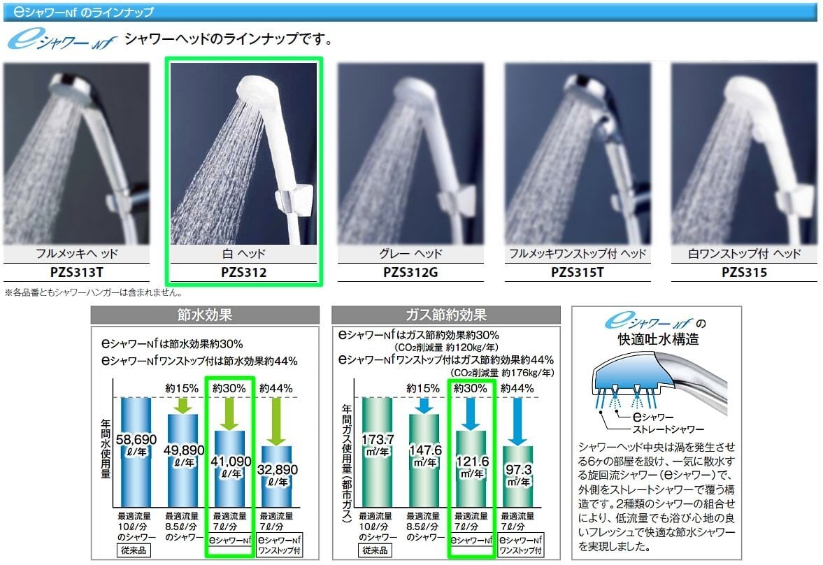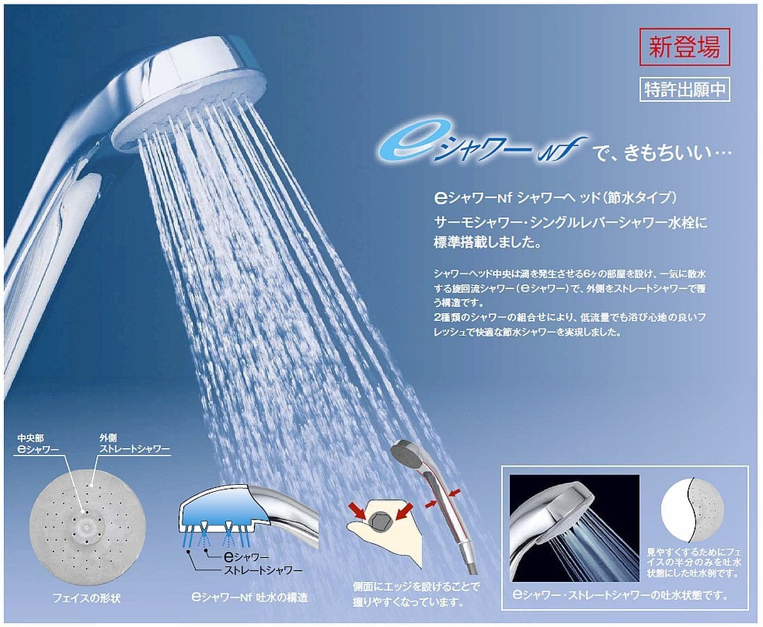 内部に渦を発生させて旋回流から吐水するeシャワーとその外部をストレートシャワーで囲むことで従来品に比べ約30%の節水効果とたっぷりした浴び心地を両立した新シャワーヘッド