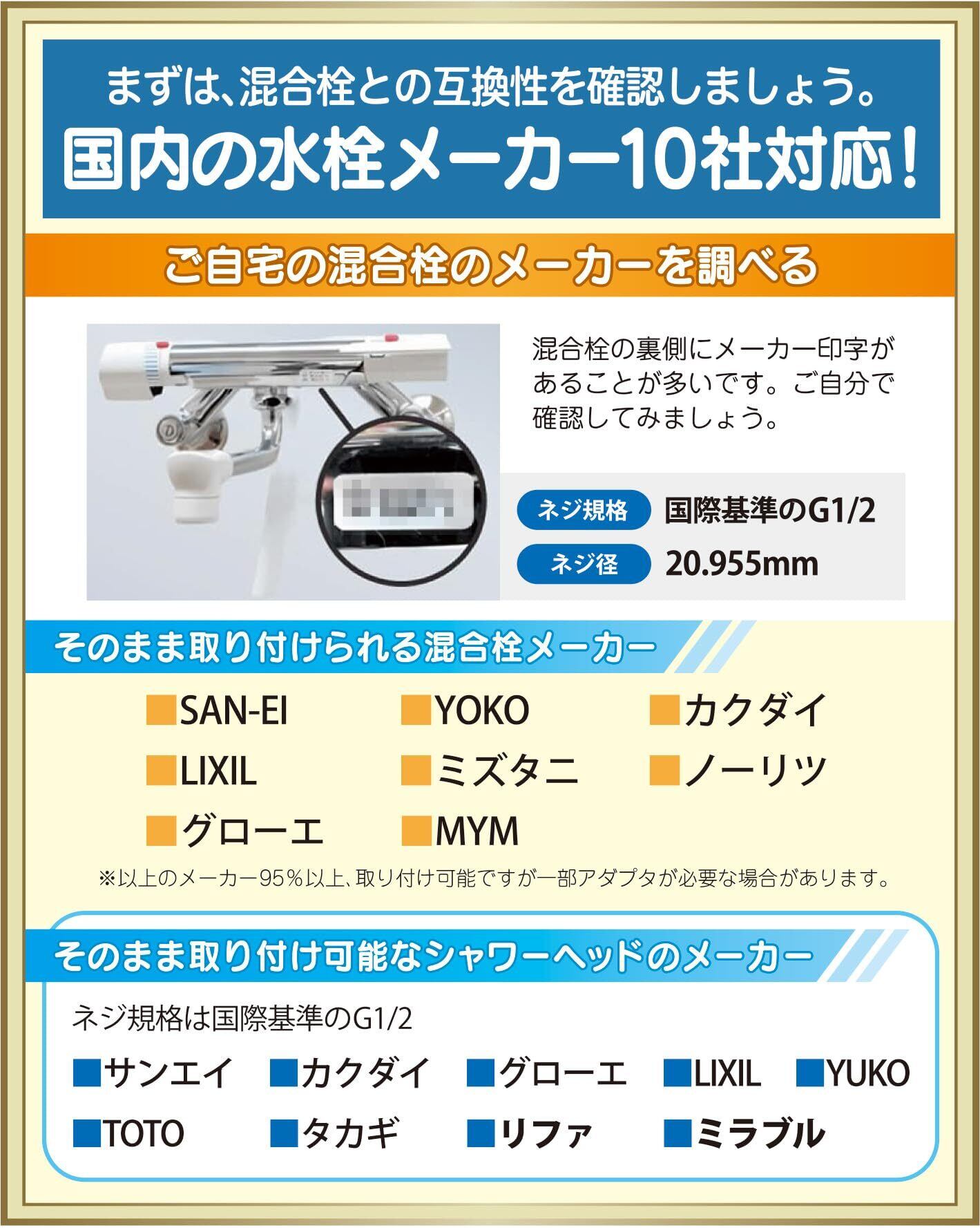 <互換性>シャワーホースのネジ規格は、国際規格のG1/2を採用しており、国内の混合水栓メーカー8社、取付可能です。国内の混合栓の70%はそのまま取り付けができます。 KVK、TOTOの混合栓を利用されている方は、アダプタ付きのセットをご購入ください。 そのまま取り付けができるメーカーは、LIXIL(一部を除く)、MYM、カクダイ、グローエ、YOKO、ミズタニ、サンエイ、ノーリツ、他。 ※一部取り付けができない場合があります。LIXIL,INAXのスイッチシャワー混合栓,バランス釜など2~30年以上前の混合栓は別途アダプタが必要になります。