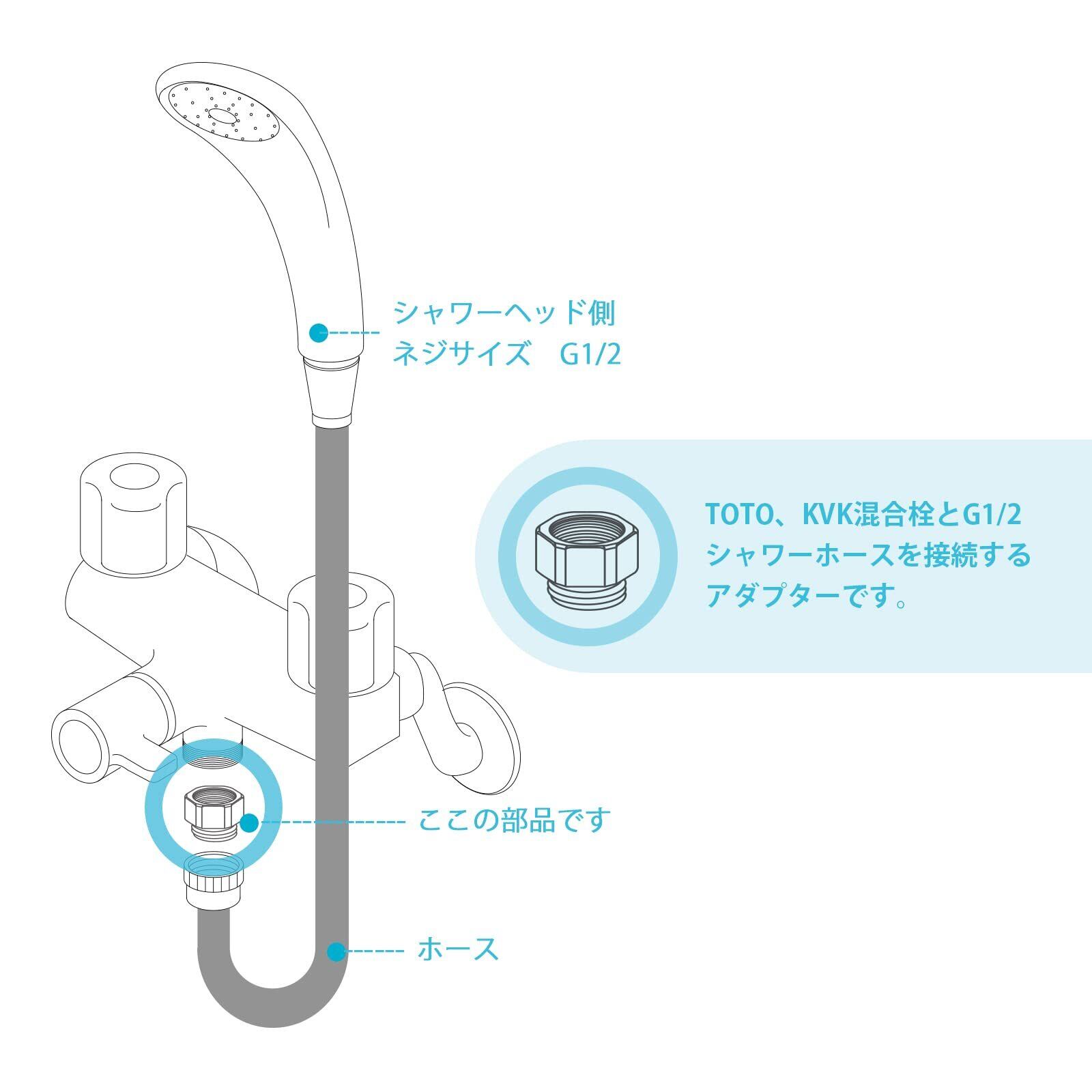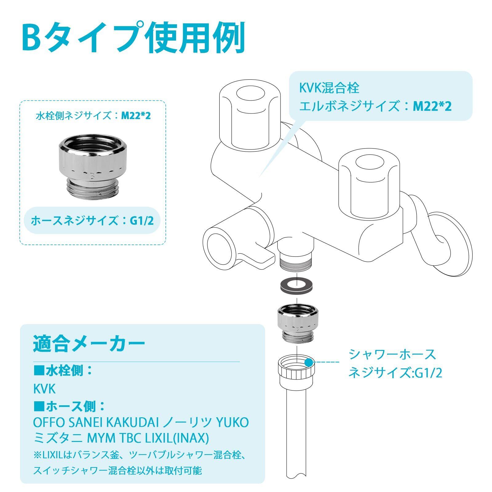 [適合するホースのメーカー] 本商品はネジサイズ がG1/2のシャワーホースに適合します。適合するメーカーはOFFO、INAX、KAKUDAI、SAN-EI、MYM、YUKOなどです。本品はKVKシャワーホースに適用できないので、ご注意ください。