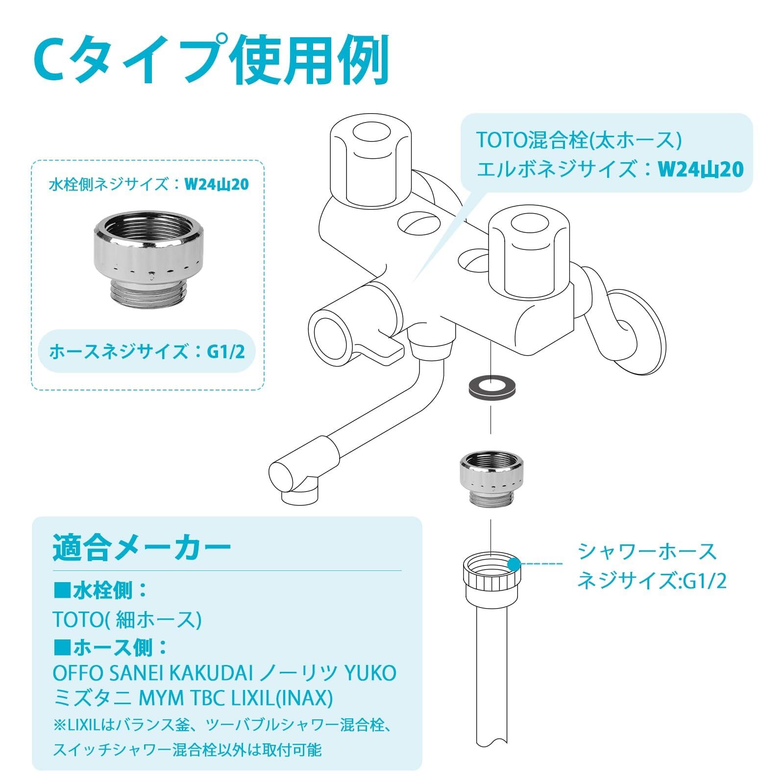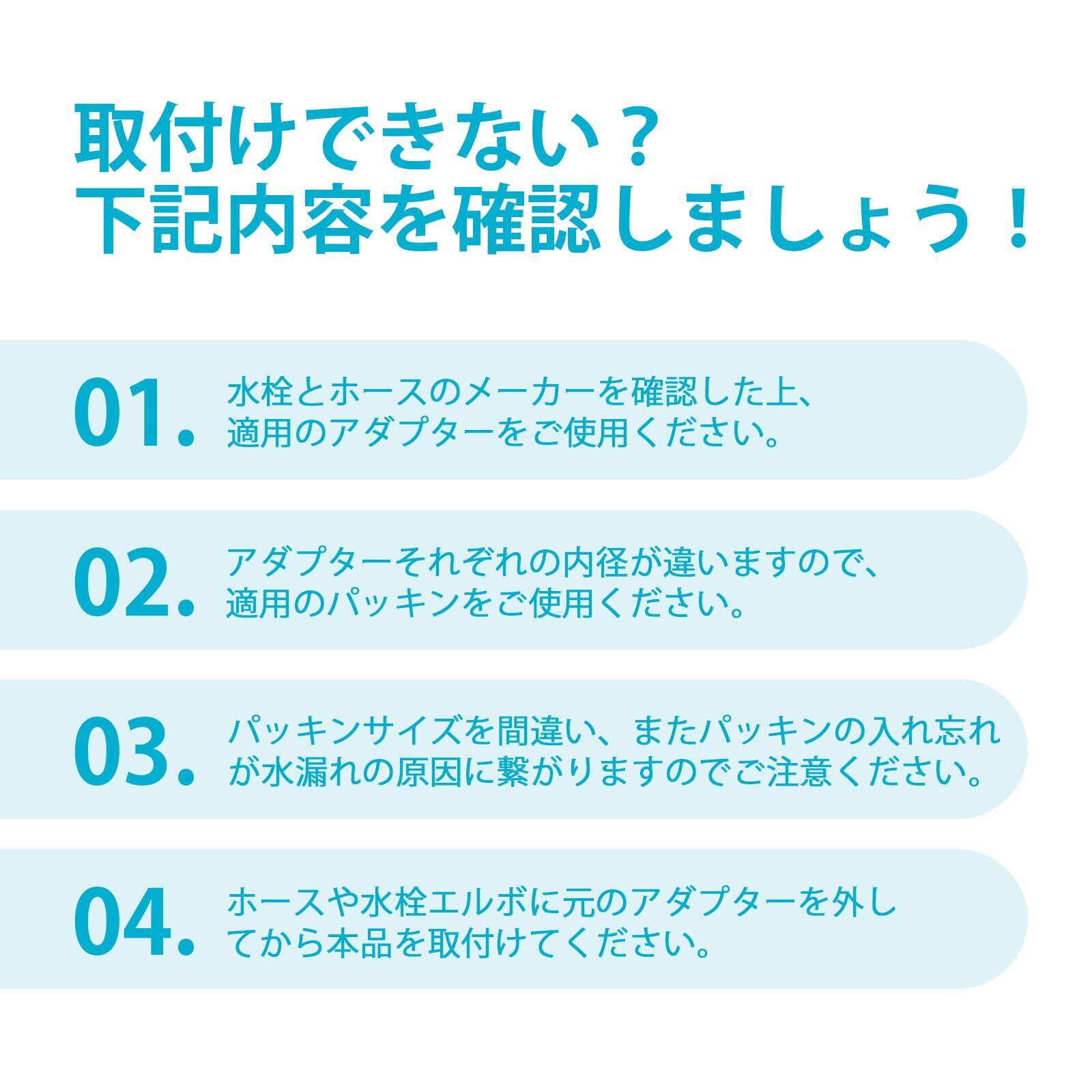 [用途] 混合栓とシャワーホース接続部のネジサイズが合わない際には、この中に適合のアダプターをお使いください。この製品は混合栓とホースを接続するのみにご使用ください。水漏の場合、同梱のパッキンを増減して調整してください。