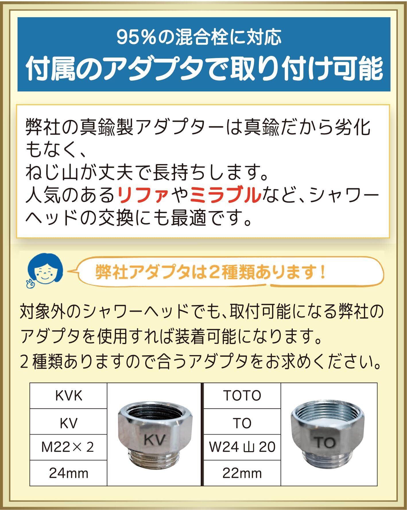 <互換性>シャワーホースのネジ規格は、国際規格のG1/2を採用しており、国内の混合水栓メーカー8社、取付可能です。国内の混合栓の70%はそのまま取り付けができます。 KVK、TOTOの混合栓を利用されている方は、アダプタ付きのセットをご購入ください。 そのまま取り付けができるメーカーは、LIXIL(一部を除く)、MYM、カクダイ、グローエ、YOKO、ミズタニ、サンエイ、ノーリツ、他。 ※一部取り付けができない場合があります。LIXIL,INAXのスイッチシャワー混合栓,バランス釜など2~30年以上前の混合栓は別途アダプタが必要になります。