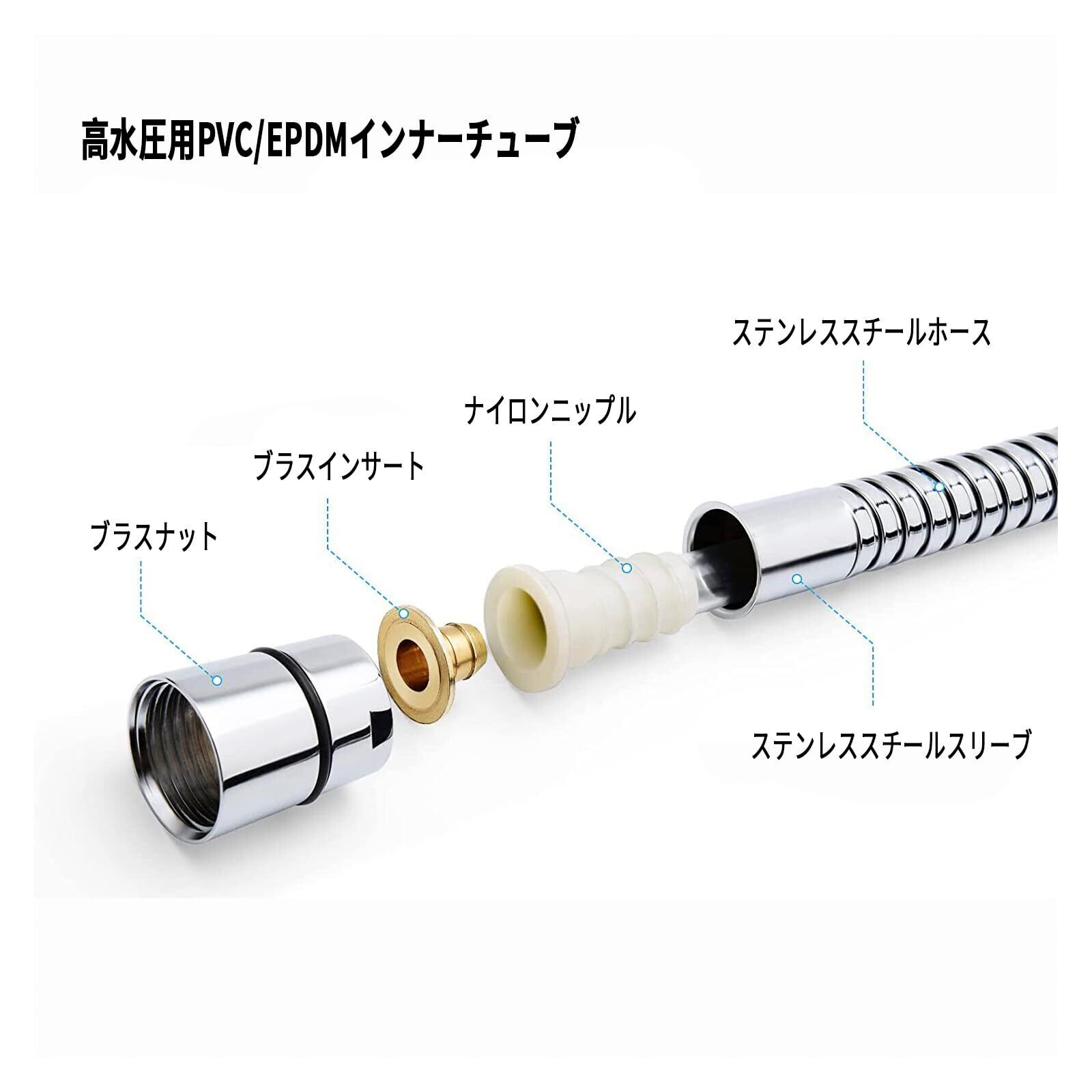 【耐久性】シャワーホースの接続部はA級鍛造真鍮を精密加工しており、高い強度と耐久性を実現。ステンレス外管とPVC内管の組み合わせで軽量かつ長寿命を両立。表面のメッキ加工は密着性に優れ、剥がれにくい設計。光沢感ある仕上げで日常のメンテナンスも容易です。