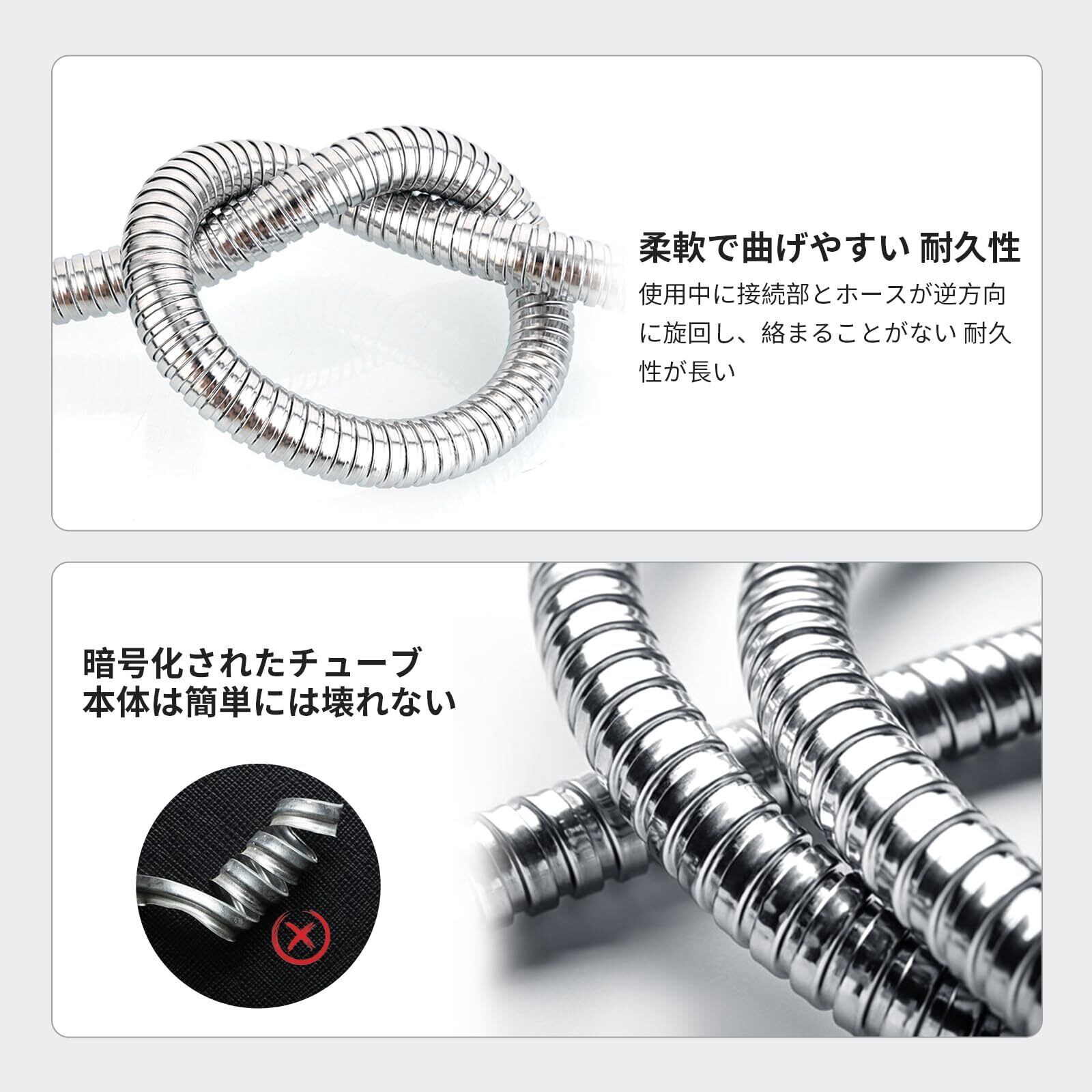 360°回転可能な接続部で絡まりにくく、軽量で柔軟性に優れたデザイン。使用後もスッキリ収納でき、バスルームを清潔に保ちます。金属製ながら取り回しが簡単なのが特徴です。