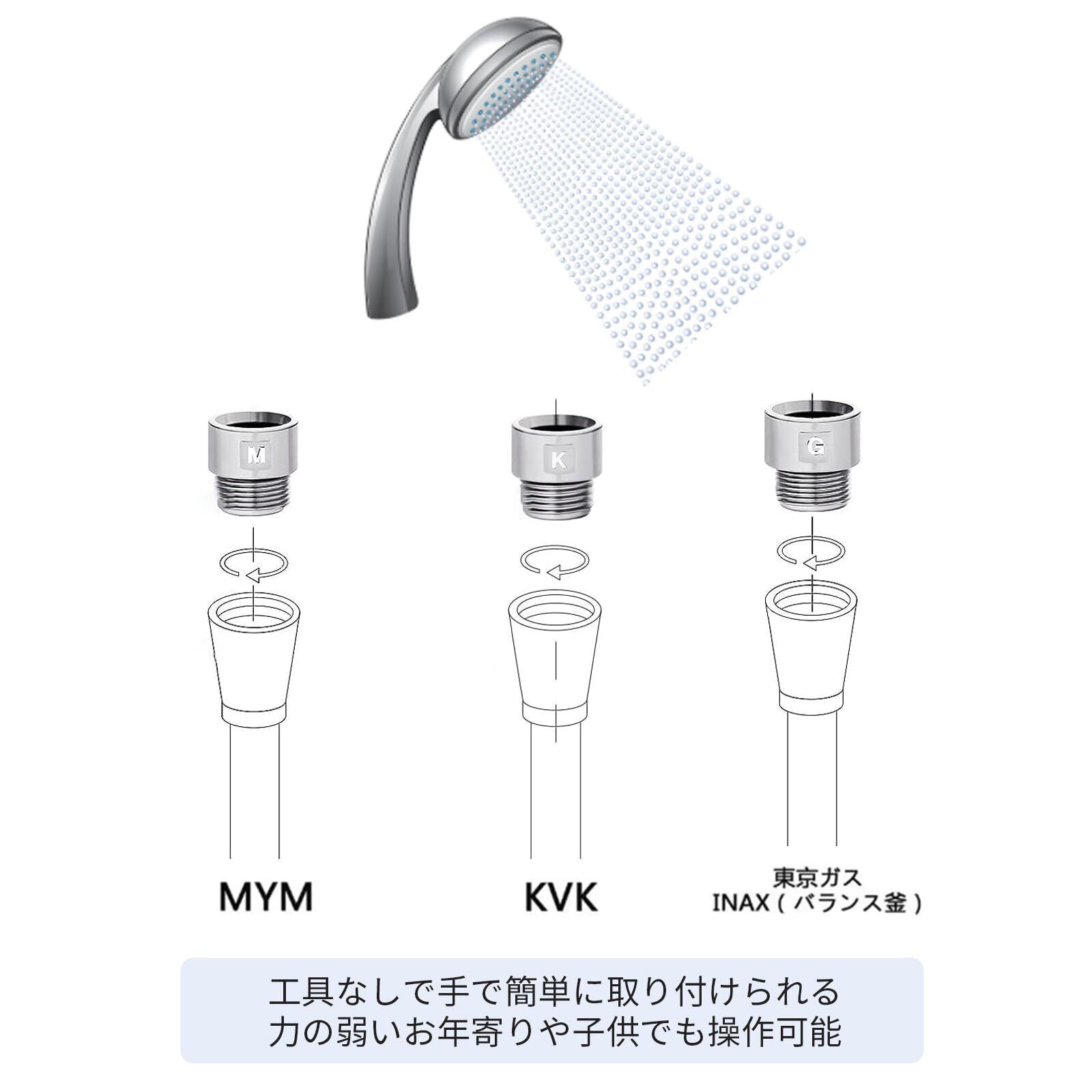 取り付けは工具不要で簡単ですが、TOTO・KVK・INAX・東京ガス・リンナイ・ミタニ・大阪ガスなどの蛇口には別売りアダプターが必要です(本製品にはアダプターは付属しません)。
