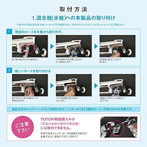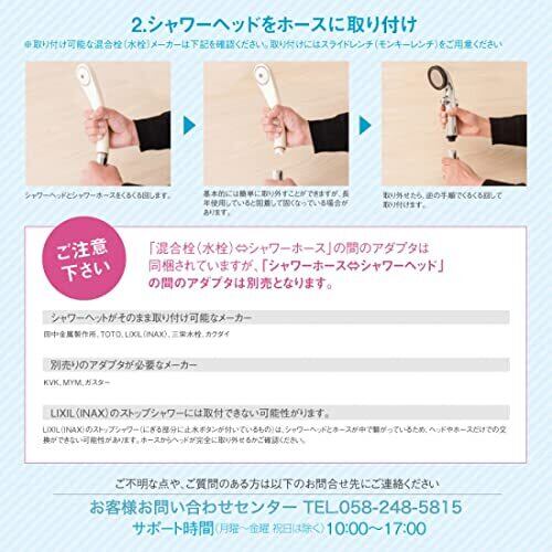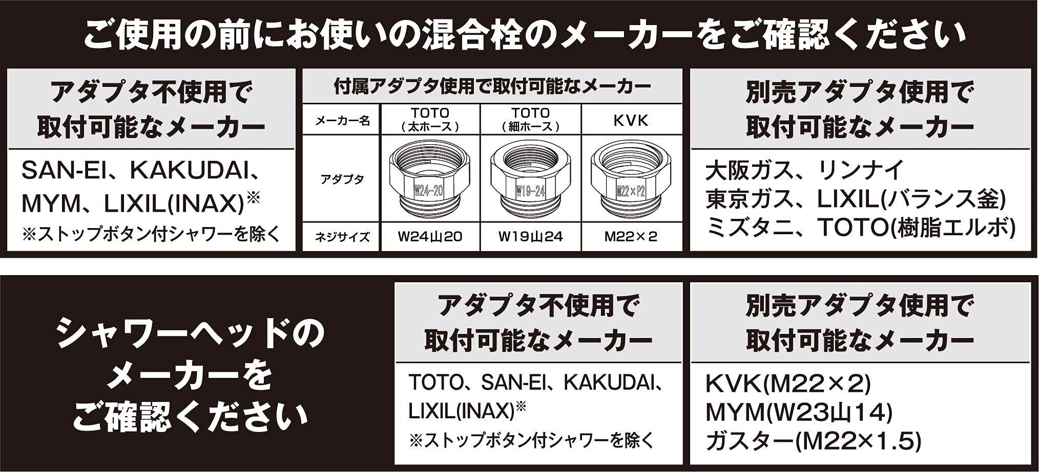 【取付可能メーカー】TKS・TOTO・LIXIL/INAX・SAN-EI・Takagi・GROHE・KAKUDAI※LIXIL(INAX)はストップボタン付シャワーを除く<付属アダプタ使用で取付可能なメーカー>MYM・KVK・ガスター・TOTO(太ホース)【W24山20】、TOTO(細ホース)【W19山24】、KVK【M22×2】※TOTOの樹脂エルボ(水栓とシャワーホースを接続する部分が金属ではなく、樹脂のタイプ)には取付できません。※シャワーヘッドのメーカーによっては接続する際に別売のアダプタが必要になる場合があります。