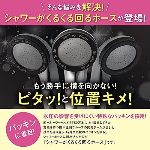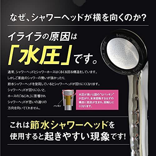 【日本製】シャワーヘッド接続部分に回転金具を内蔵し水圧の影響を受けにくい特殊なパッキンを採用したホースは、勝手に横を向かず位置を決めたらピタッと動きません。シャワーヘッドが勝手に横を向く原因は“水圧”。節水シャワーヘッドを使用すると起きやすい現象です。シャワーを浴びる時のストレスを一発で解消し、シャワーヘッドを持った時の操作性もスムーズ。いつものバスタイムを快適に。