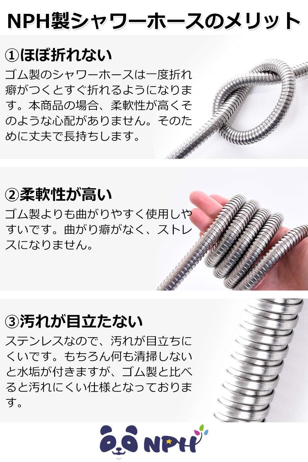 3【 シャワーホース メリット 】 ①「ほぼ折れない」ゴム製のシャワーホースは一度折れ癖がつくと折れやすくなるのがゴム製です。本商品の場合、柔軟性が高くそのような心配がありません。そのために丈夫で長持ちします。②「柔軟性が高い」ゴム製よりも曲がりやすく使用しやすいです。曲がり癖がなく、ストレスになりません。③「汚れが目立たない」ステンレスなので、汚れが目立ちにくいです。もちろん何も清掃しないと水垢が付きますが、ゴム製と比べると汚れにくい仕様となっております。