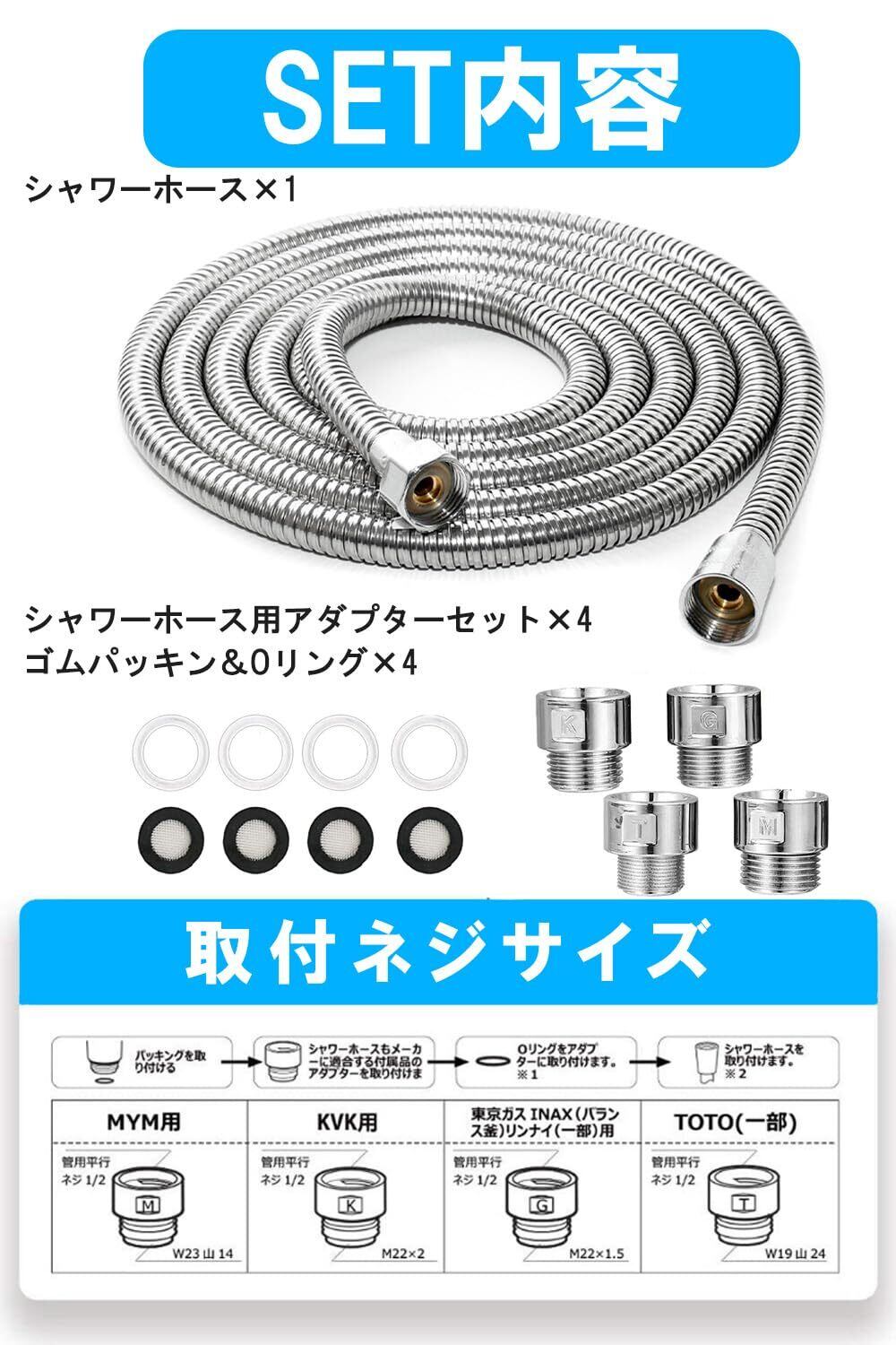 1【 用 シャワーホース 】 シャワーホースは消耗品です。何気なくずっと使っていますが、実はシャワーホースの寿命は5年ほどと言われています。劣化すると「ホースが固くなる」「ひび割れ」「水漏れ」が起こります。シャワーとホースのつなぎ目の部分などか水漏れが発生した場合には、シャワーヘッドではなくて、ホースの劣化が原因かもしれません。「NPH」製のシャワーホースは、サイズが合えば様々なタイプと可能です!内側は高品質なPVCゴムを使用し、無害、無臭、高水圧、水温(冷水、高温水)に耐えることが可能です。付属のアダプターを使用することでほとんどのメーカーで利用可能です。
