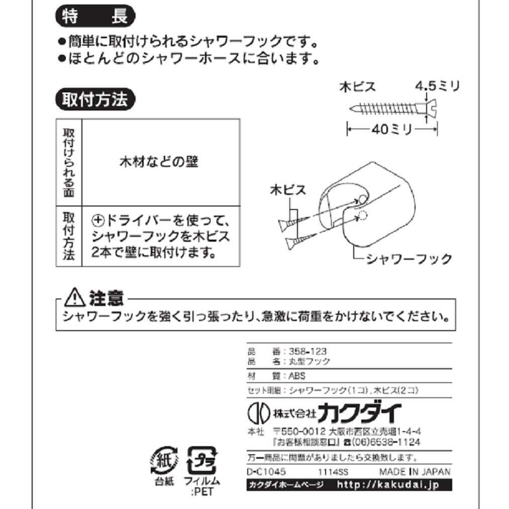 カクダイ バス シャワーフック 丸型フック ホワイト 358-123