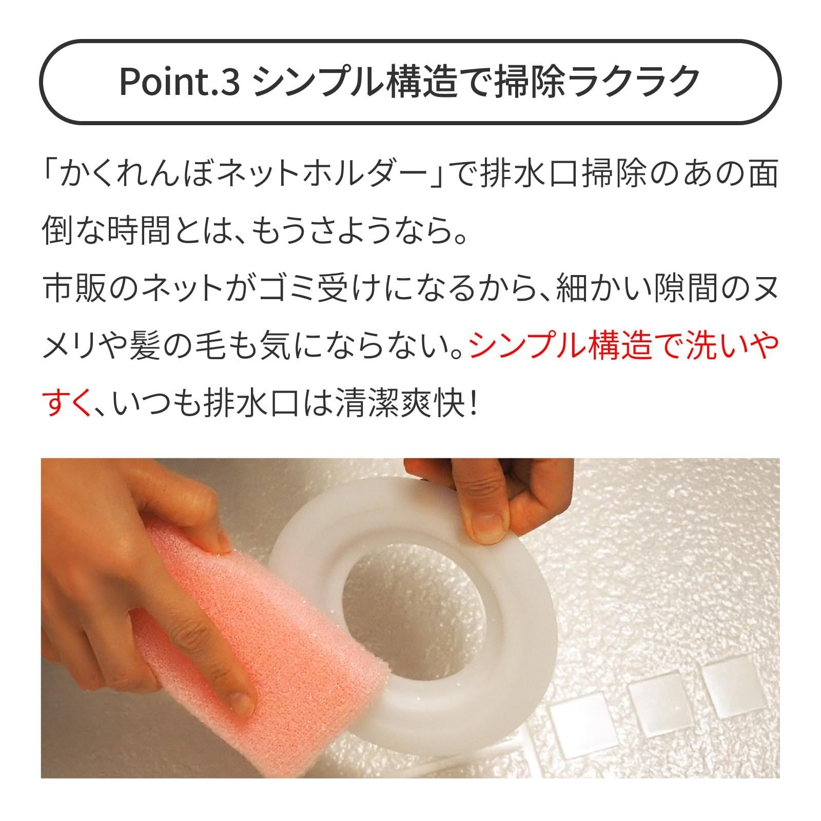 Point3:お手入れだって、本当に簡単 パーツは3つだけ。サッと洗えば、いつも清潔。面倒なヌメリ掃除とはもうサヨナラ!