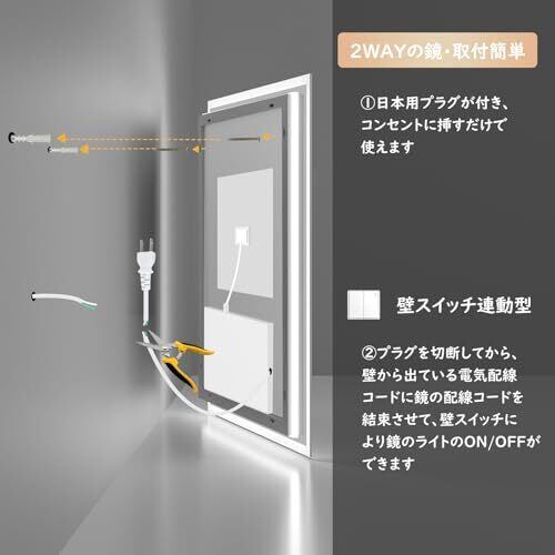 【設置簡単な洗面鏡】日本用プラグが追加された最新改良版で、組立完成品で届くため、コンセントに挿すだけなので業者に頼まなくても取り付けられます。また、使用シーンに合わせて、この壁掛け鏡は横向きにも縦向きにも取り付けられます。美容室の化粧鏡としても活用できます