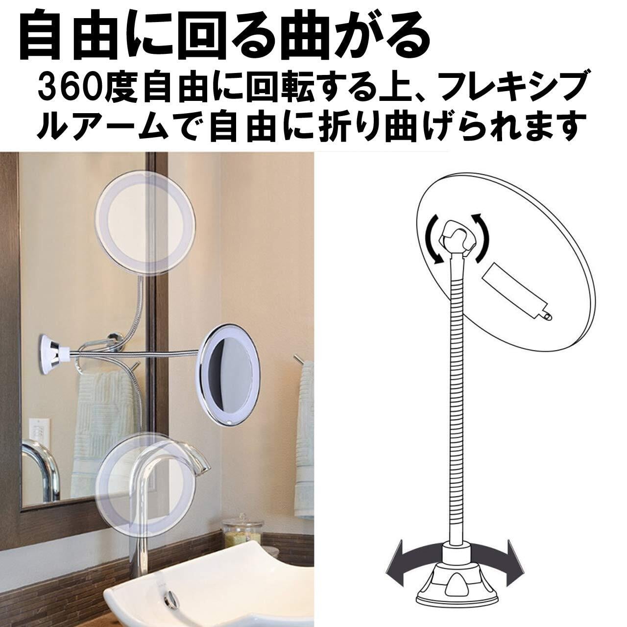 鏡は曇り止め仕様なので、洗面所でお湯を使っても曇って見えなくなることもありません。鏡は360度自由に回転する上、支柱はフレキシブルアームなので自由に折り曲げられるので自分の任意の角度で鏡を調整できます。