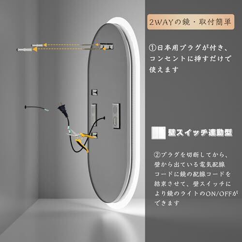 【設置簡単な壁掛け鏡】日本用プラグが追加された最新改良版で、組立完成品で届くため、コンセントに挿すだけなので業者に頼まなくても取り付けられます。ドレッサーや美容室の化粧鏡としても活用できます