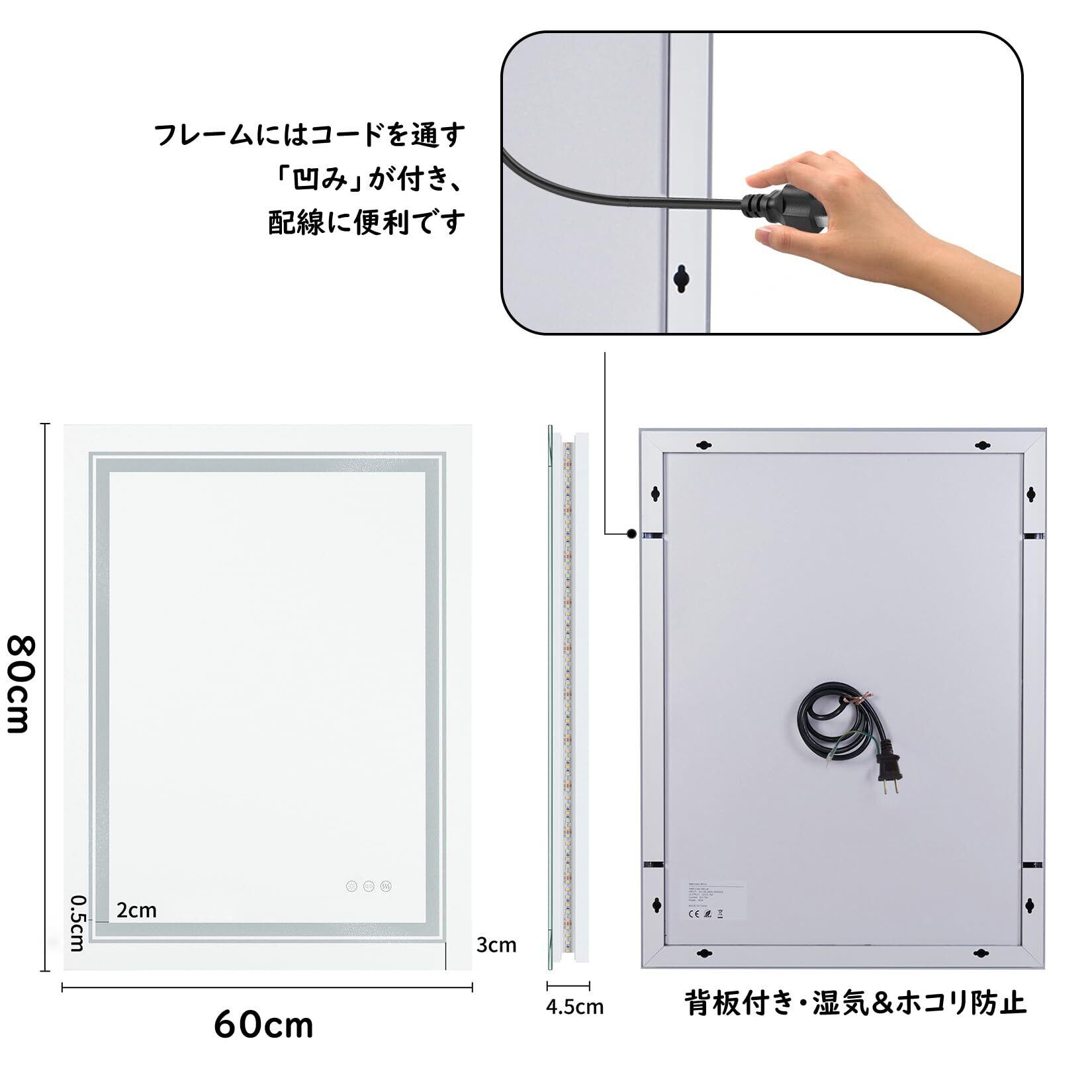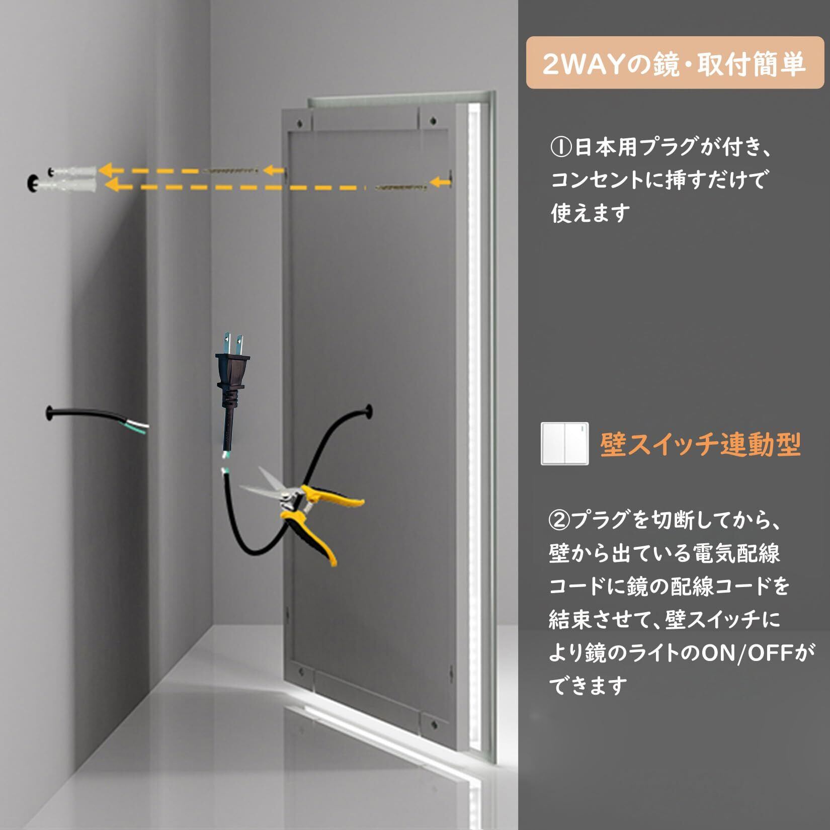 【設置簡単な壁掛け鏡】日本用プラグが付いていて、組立完成品で届くため、コンセントに挿すだけなので業者に頼まなくても取り付けられます。また、使用シーンに合わせて横向きにも縦向きにも取付可能で、幅広く活用できます