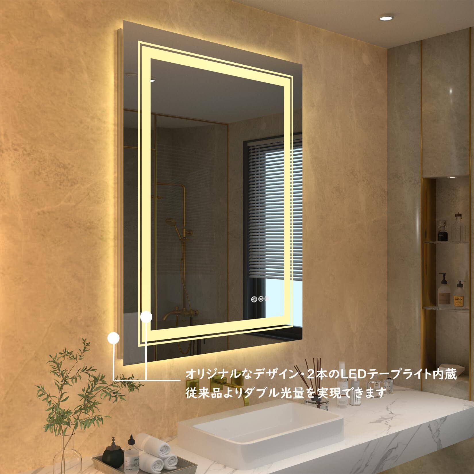 【ダブルLEDライト付き・ダブル明るさを実現します】当社の独創的な設計で、前面ライト+側面ライトとのledテープライトを2本搭載している女優ミラーで、他社品より明るくて見やすいで、化粧や髭剃りにとても便利です。更に、ON/OFFボタンは単独なので、1度だけタッチすると消灯でき、何度もタッチする必要がありません