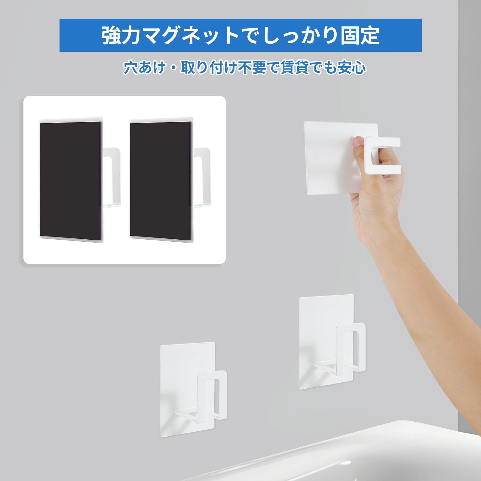 【マグネットでしっかり固定】背面は超強力マグネットでフルカバーされ、セットの耐荷重は4kg。スチール製の壁面にもしっかり固定でき、壁を傷つけることなくマグネットを取り付けることができます。穴あけや組み立てが不要なので、賃貸住宅の浴室でも使用可能。(取り付け可能な壁面:磁石が付く平らな面・スチール壁面。注:磁気吸引は貼り付ける位置の金属により、強さは異なります)