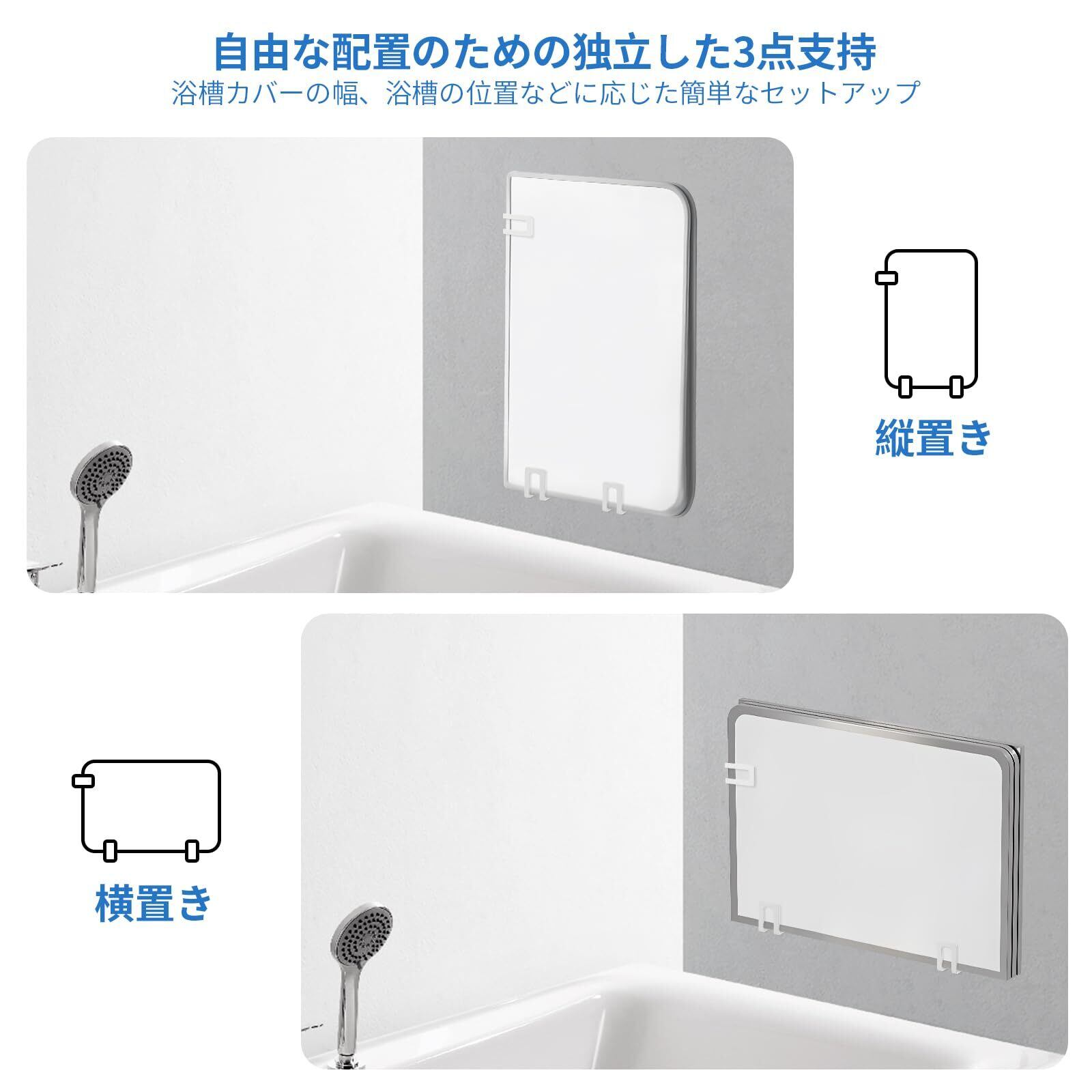 【縦置き・横置き自在】3点で支えるので、風呂ふたの大きさに合わせてレイアウトでき、バスルームスペースを収納に有効活用できます。分離式、移動や位置調整が簡単です!壁掛け収納、床を取らず、バスルームの床を素早く掃除でき、バスタブの蓋を移働する必要もありません。