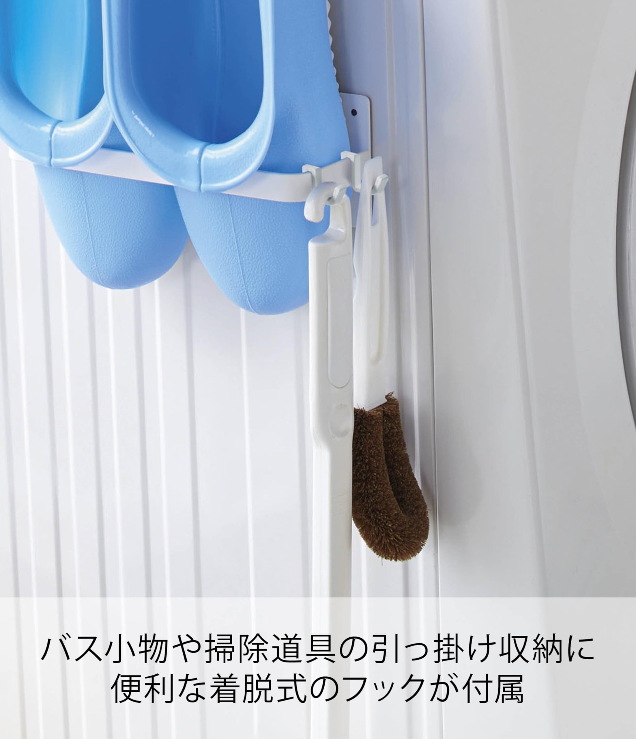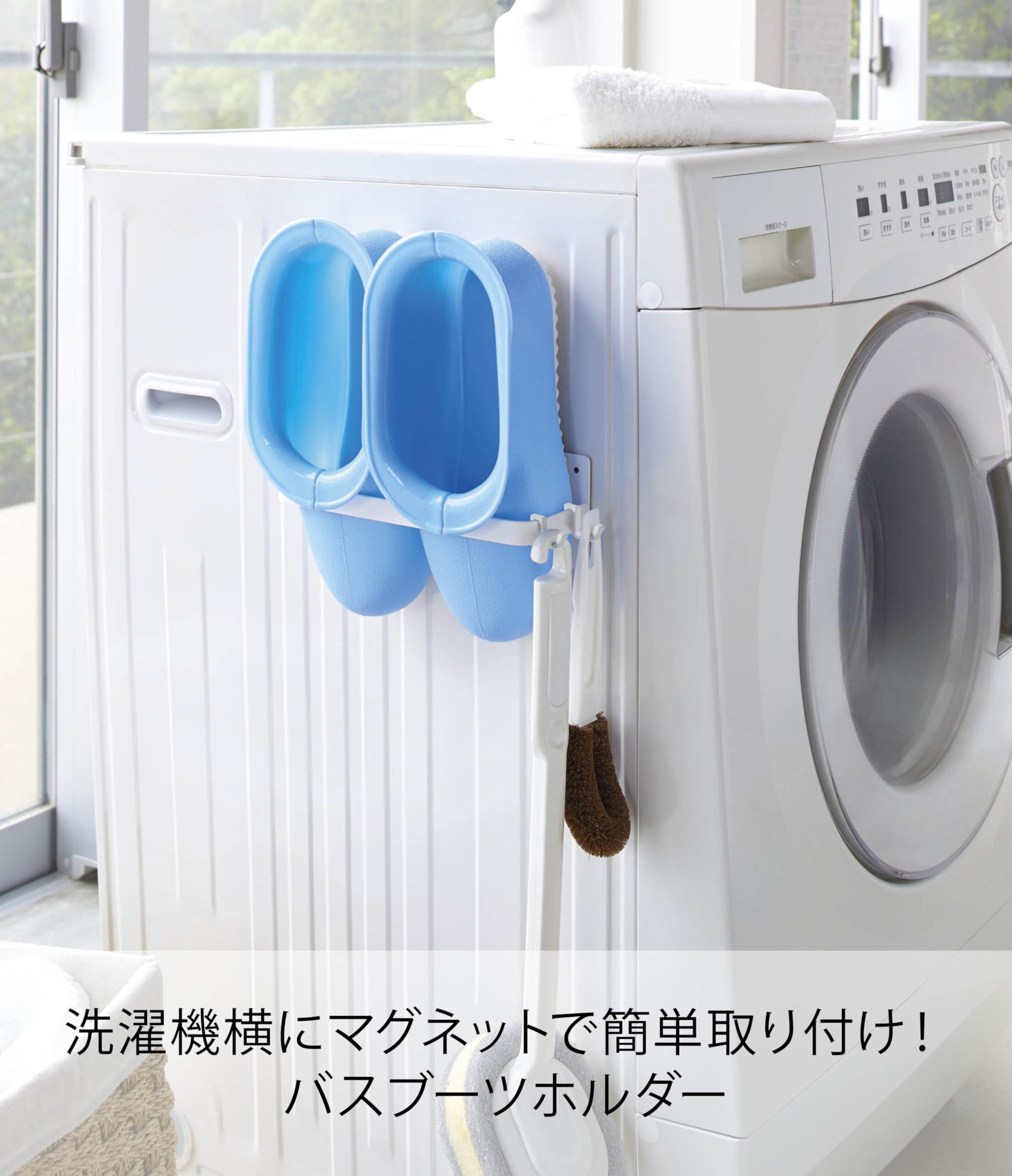 置き場所に困るバスブーツを洗濯機横に磁石でスリムに収納。タオルハンガーとしても使えます。深型ブーツも収納可能。ハンドスプレーや靴ブラシなどの掃除道具も一括収納。