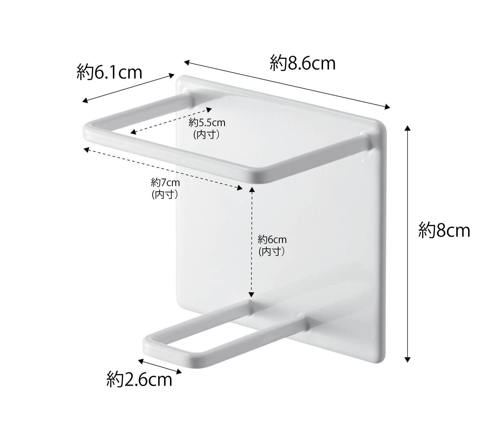 ■サイズ:約8.6×6.1×8cm、■素材:本体/スチール(ユニクロメッキ+粉体塗装)・マグネット,滑り止め/シリコーン、■耐荷重:約750g、■取り付け可能な壁面:マグネットが付く平らな面、■カラー:ホワイト