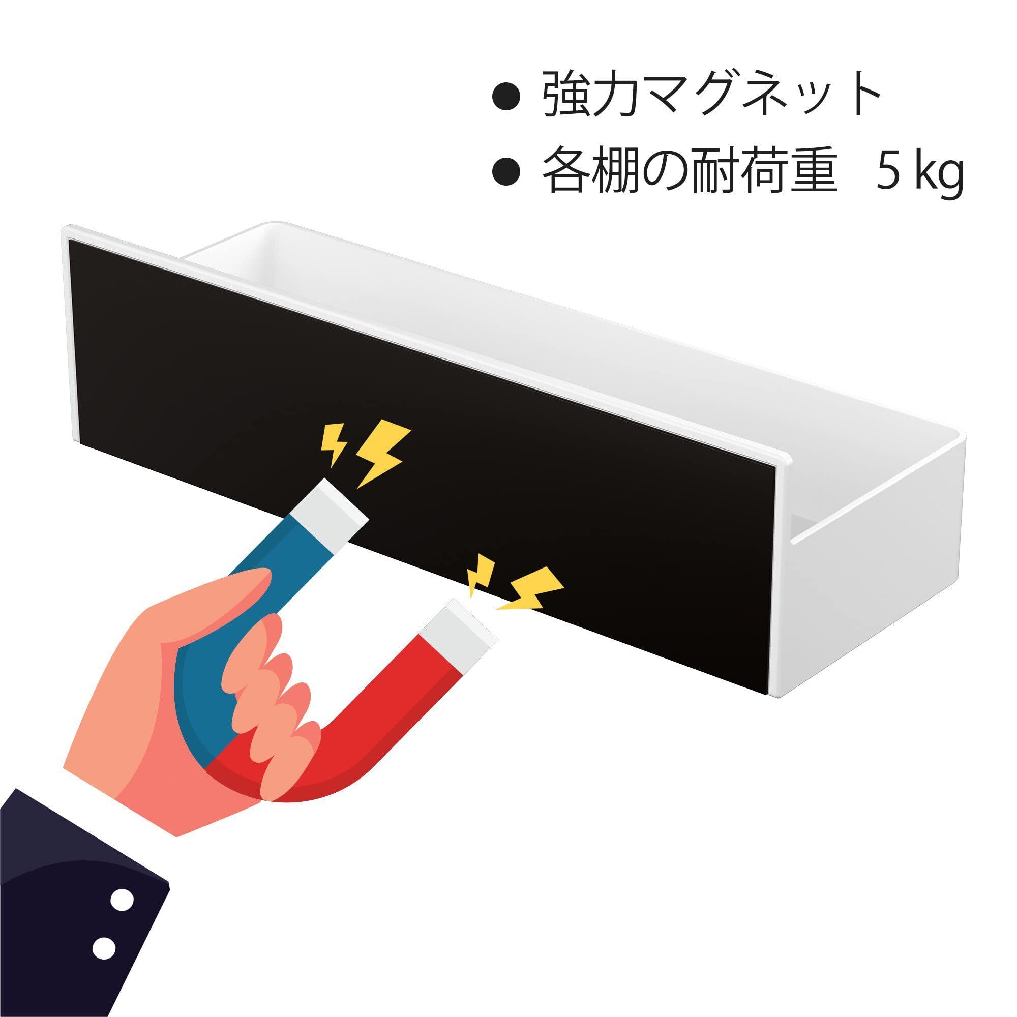 【防水と防錆】材質:ABS樹脂、耐荷重5kg。マグネット棚はABS素材でできており、完全な防錆特性を持ち、掃除が簡単です。取り付け可能な壁面:マグネットが付く平らな面・スチール壁面。