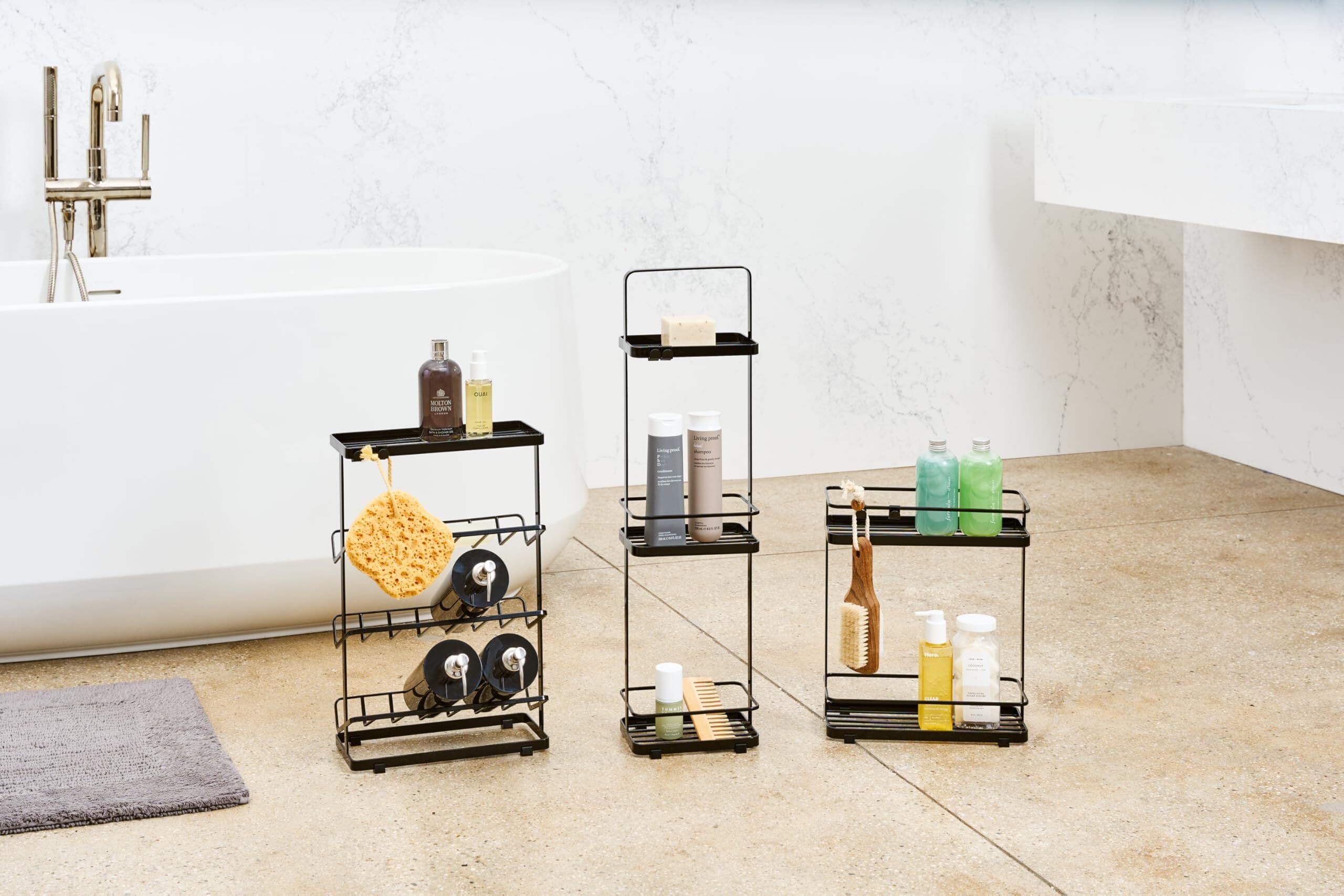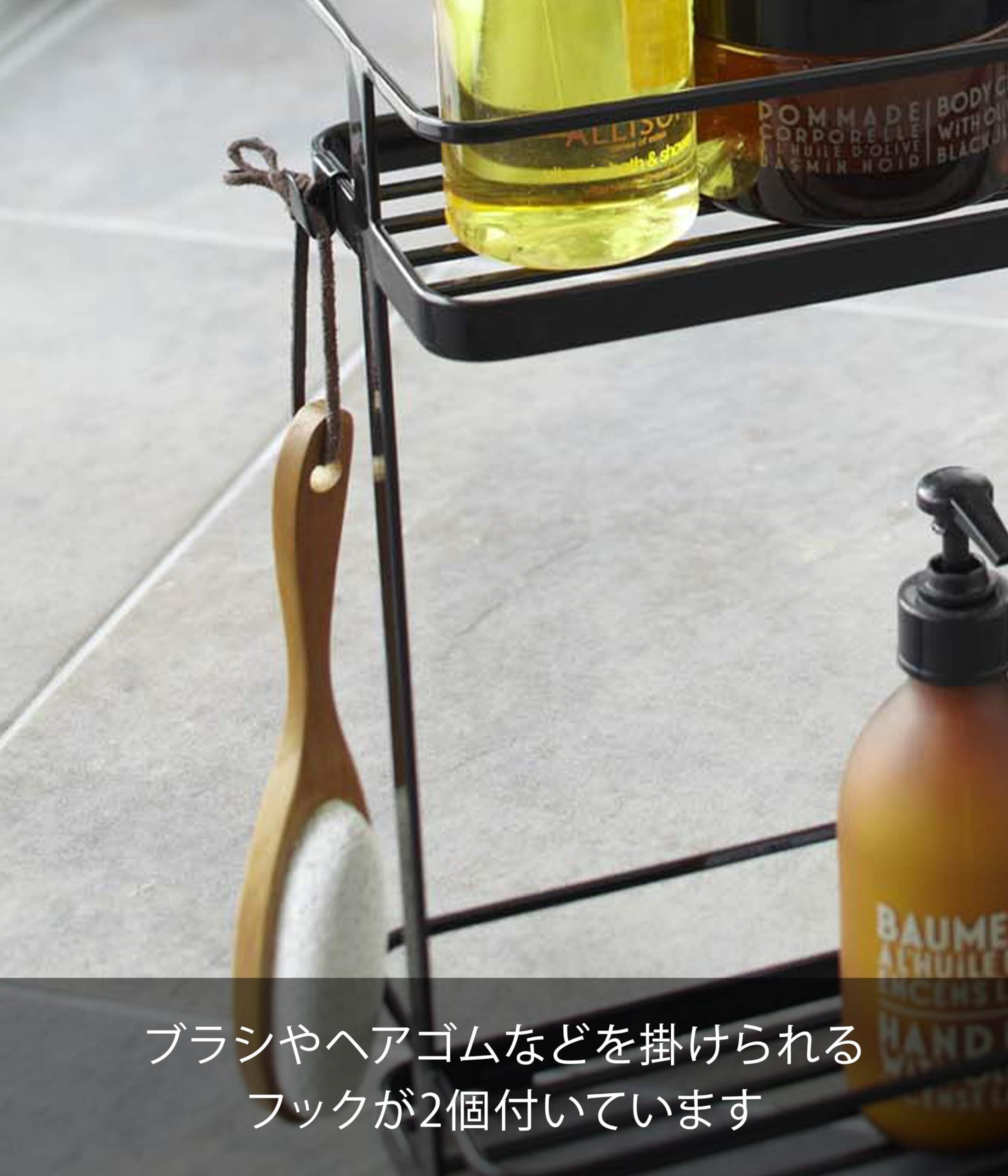 バスルームで圧迫感を感じさせないスタイリッシュなディスペンサースタンド。ワイドでもスッキリ薄型で浴室の角に置いても場所を取らないタテ置きタイプ。安定感もしっかりで6本収納可能。ブラシや輪ゴムなどを引っ掛けられる取り外し式フック付き。