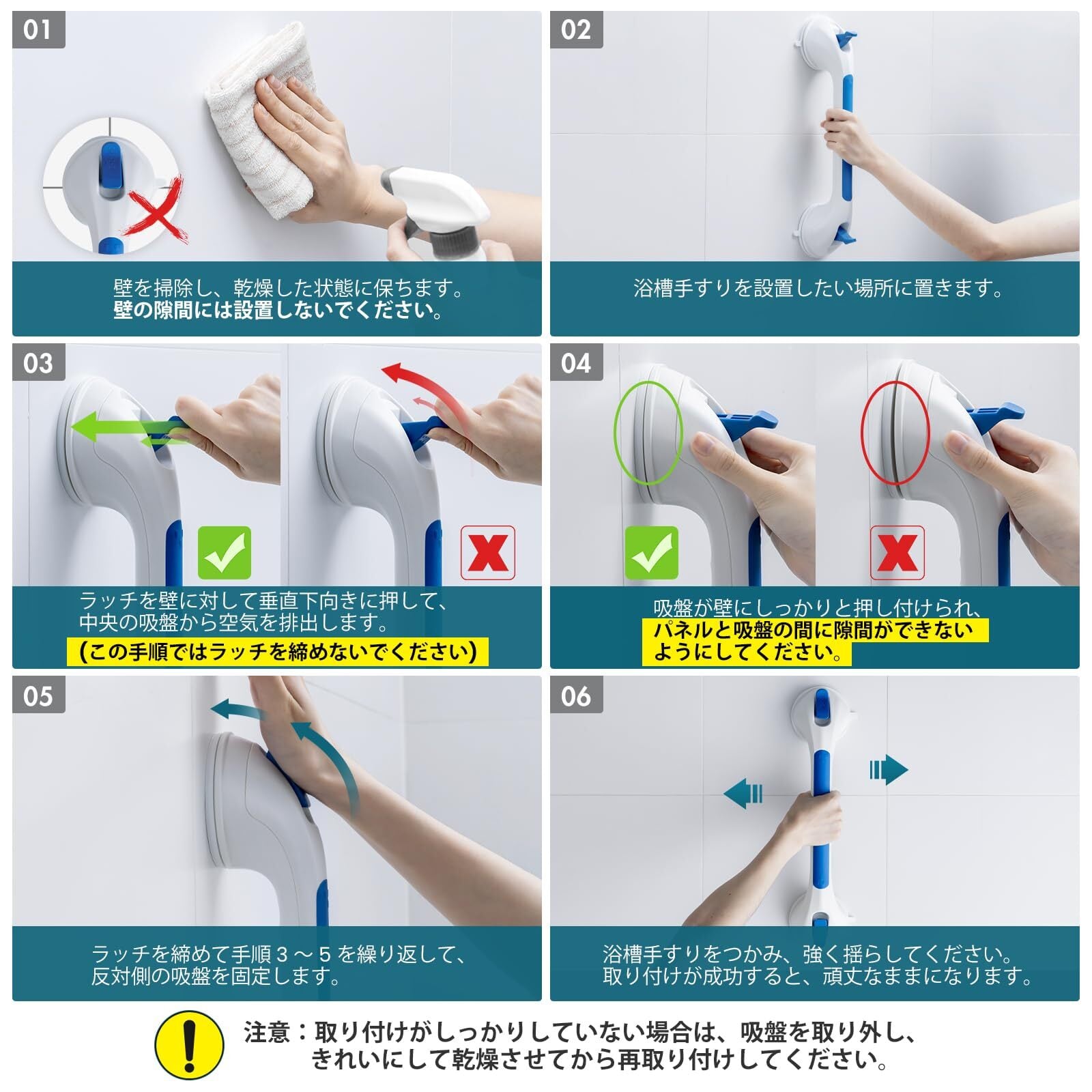 風呂手すり 取り付け簡単:風呂手すりは吸盤式で、壁に穴を開けずに取り付けられます。穴あけ、接着剤、工事不要です。取り外したい場合は、ロックレバーの2つのラッチを解除します、小さなハンドルは吸盤の取り外しに役立ちます、壁にダメージを与えることはありません