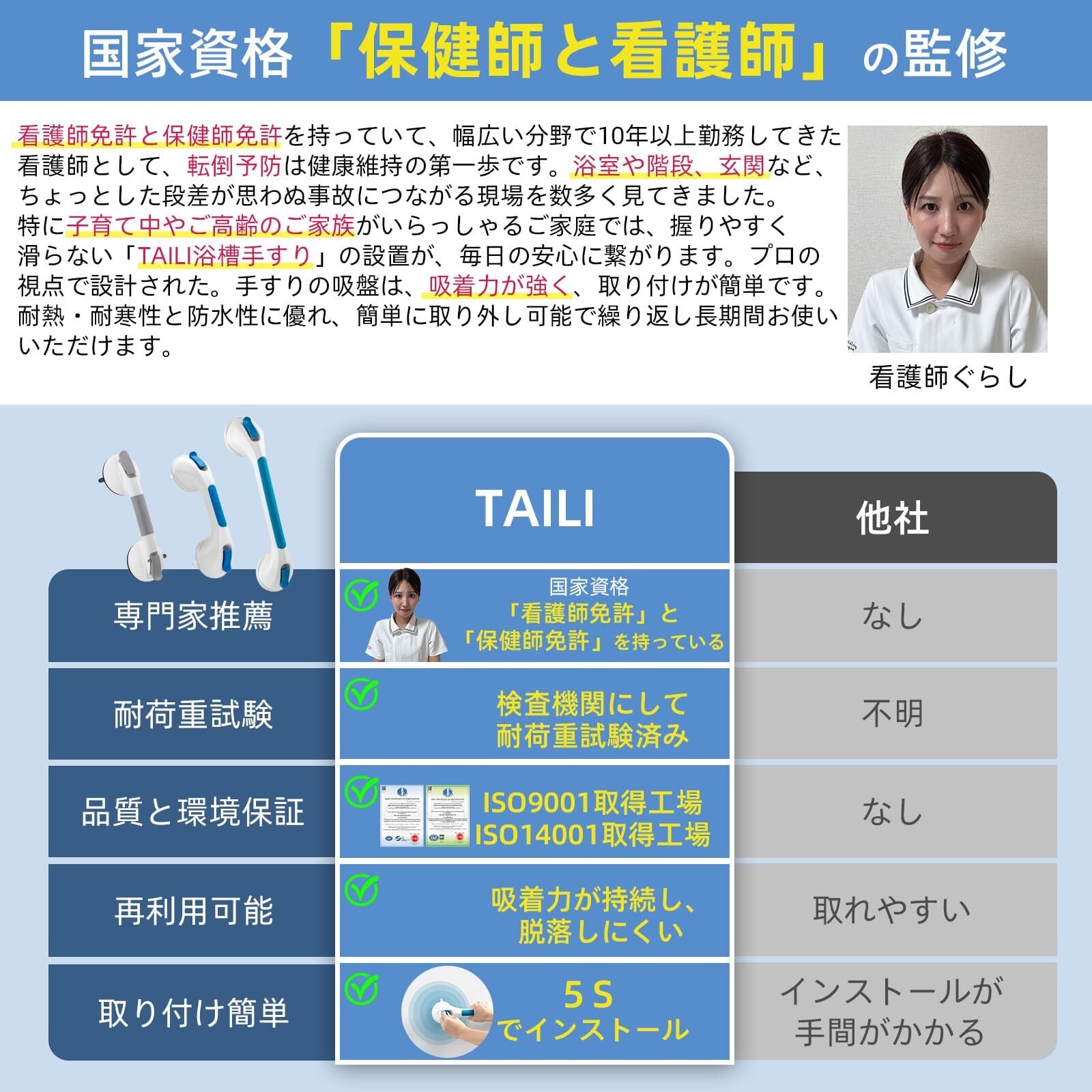 TAILI 手すり 強力吸盤 浴槽手すり 吸盤シャワー 風呂 ドアハンドル ドアノブ 取っ手 浴室 トイレ バス 玄関手摺 入浴介助 高齢者 子供 転倒 予防 敬老の日 穴あけ不要 取り付け簡単 ブルー