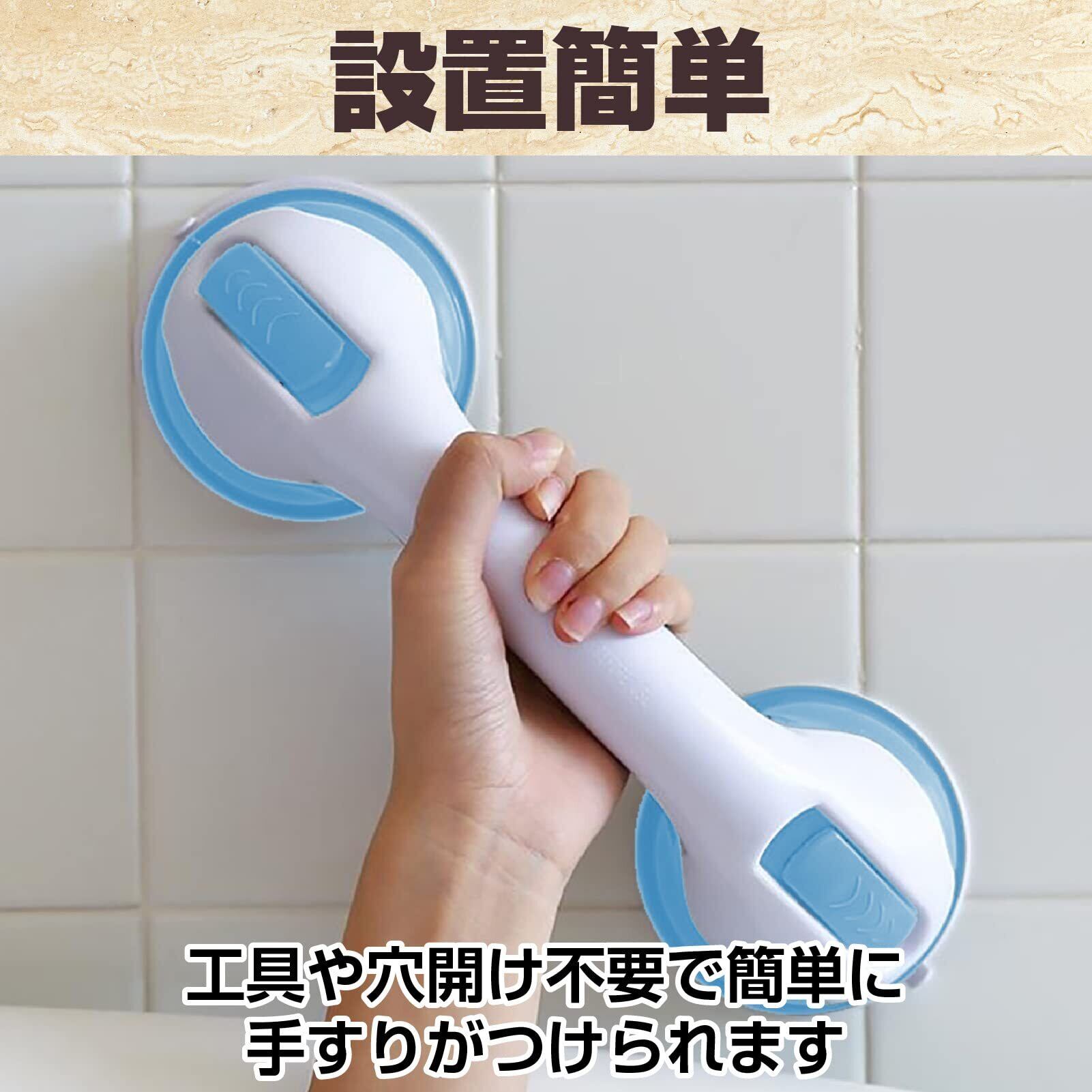 【取り付け簡単】3ステップ1.タイル、ガラス、大理石などの設置面の汚れを落とします2.手すりの左右のレバーを上げます。3.設置個所に手すりを当て左右のレバーを下げるだけで設置完了。設置面の穴あけは不要です。