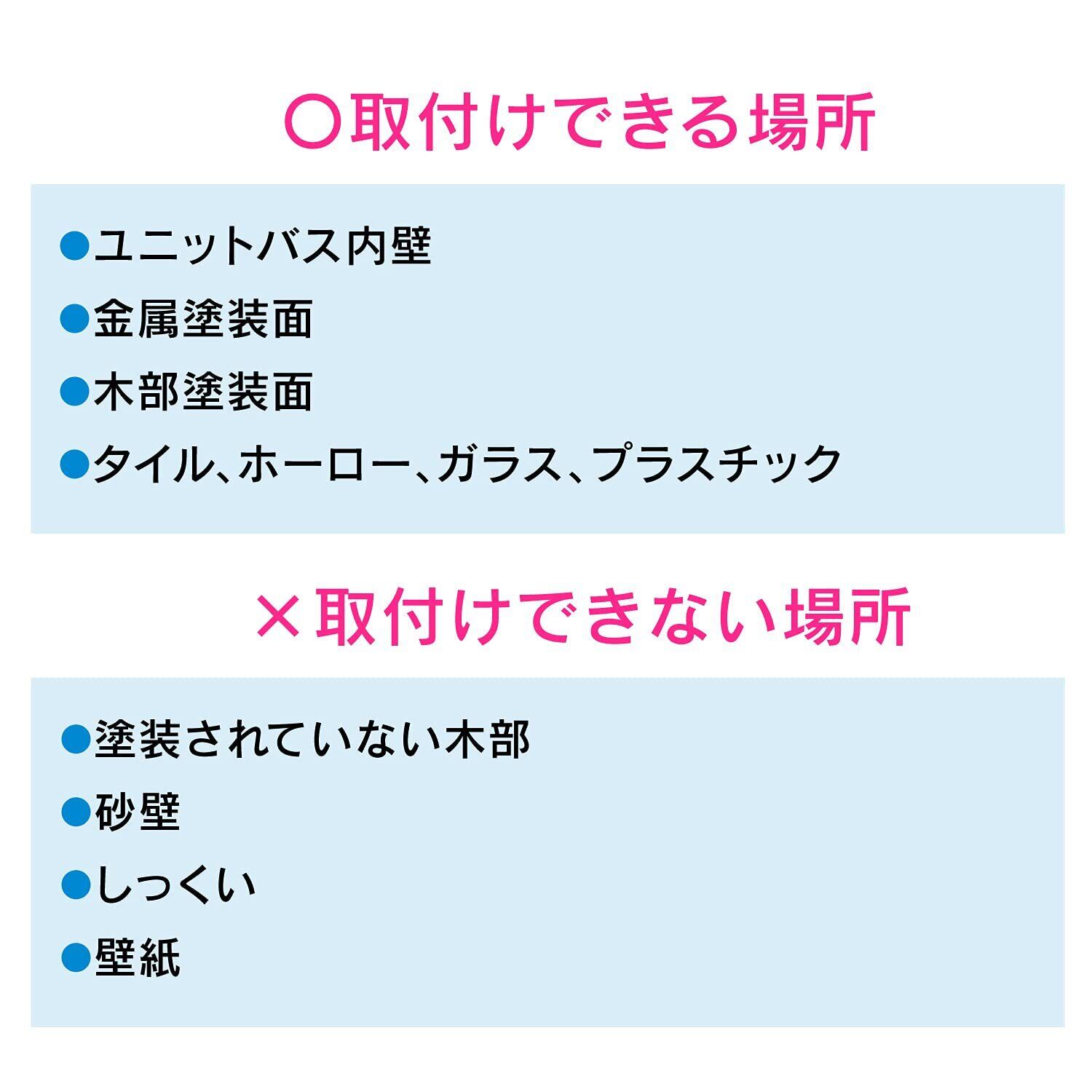 取付できる場所:ユニットバス内壁・金属塗装面・木部塗装面・タイル・ホーロー・ガラス・プラスチック