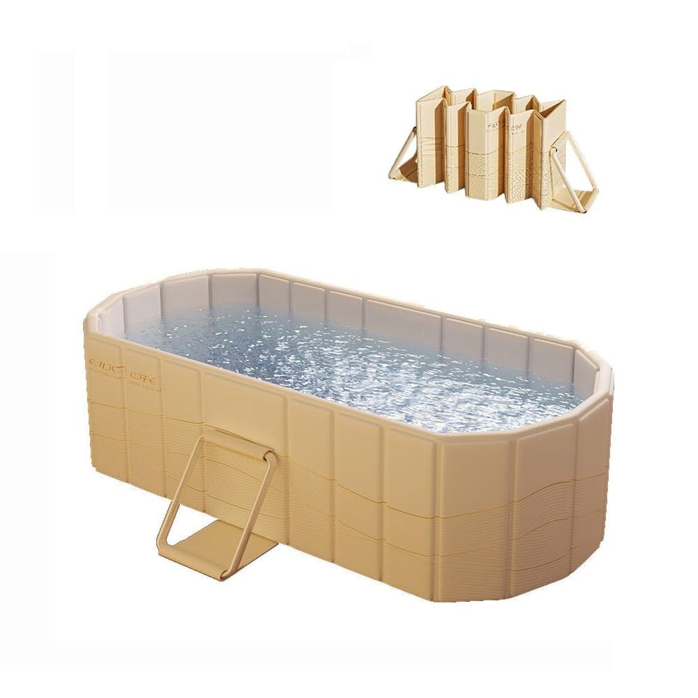 【省スペース収納、持ち運びもラクラク】:バスタブ展開のサイズ:長さ120/150cm*幅86cm*高さ50cm、折りたたみサイズ:高さ52cm*厚さ10cm。折りたたみ式のデザインにより、使わない時はコンパクトに畳んで収納できます。狭いバスルームや収納スペースが限られた住宅でも場所を取りません。軽量で持ち運びやすいため、自宅だけでなく旅行先やキャンプ場、ベランダなどでも使用可能。夏にはプールや水風呂、アウトドアではアイスバスとしても活躍し、どこでも快適にお風呂を楽しめる万能なポータブルバスタブです