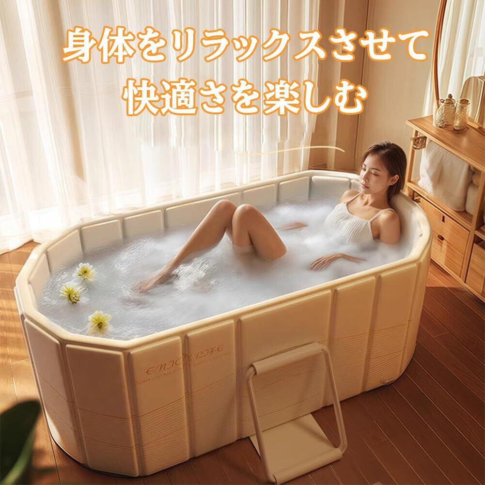 【広々としたデザインで快適なお風呂時間】:従来の簡易風呂に比べて内部スペースを広めに設計しており、肩までしっかり浸かれる深さと、足をゆったり伸ばせる十分な広さを確保しています。全身を温かいお湯に包まれることで心身ともにリラックスでき、快適で贅沢な入浴体験を実現。自宅に居ながらスパのような心地よさを味わうことができ、毎日のリフレッシュタイムに最適です
