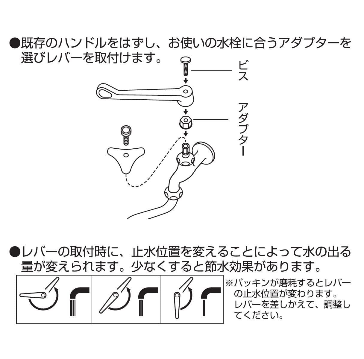 【取付方法】既存のハンドルをはずし、お使いの水栓に合うアダプターを選びレバーを取り付けます。